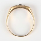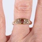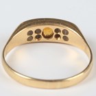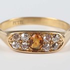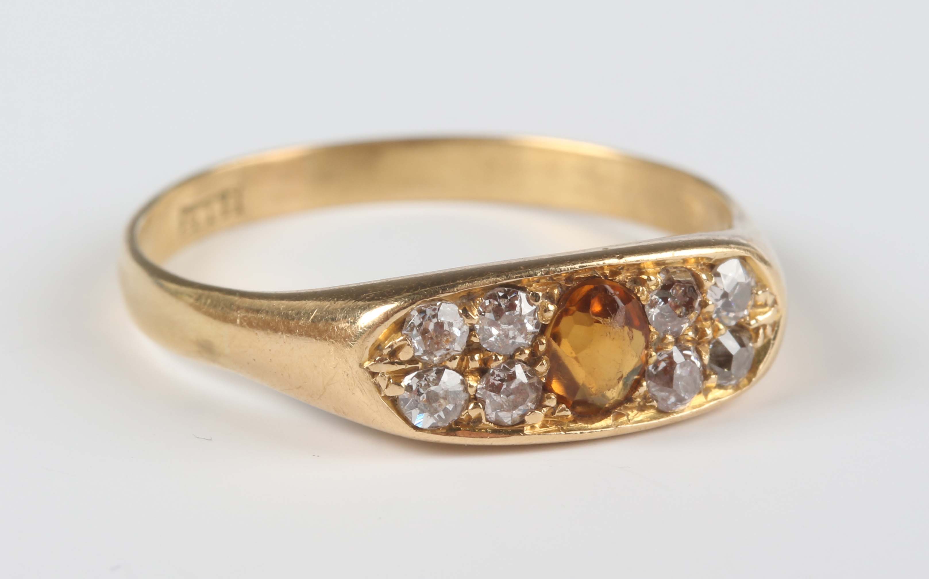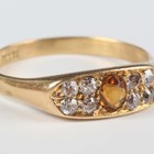 A gold ring, mounted with a cushion shaped citrine between cushion shaped diamond set four stone sides, detailed ‘18ct’, weight 3.7g, ring size approx R1/2.