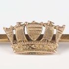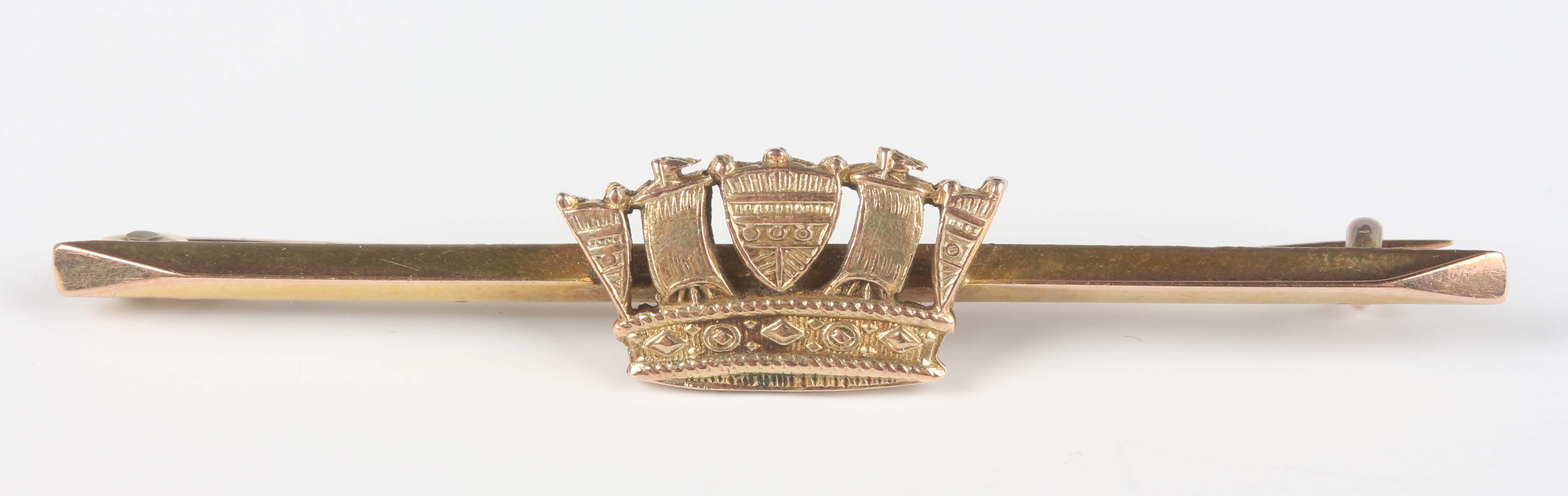 A gold bar brooch with a naval crown motif, detailed '9ct', weight 4g, width 5.7cm, with a case.