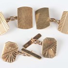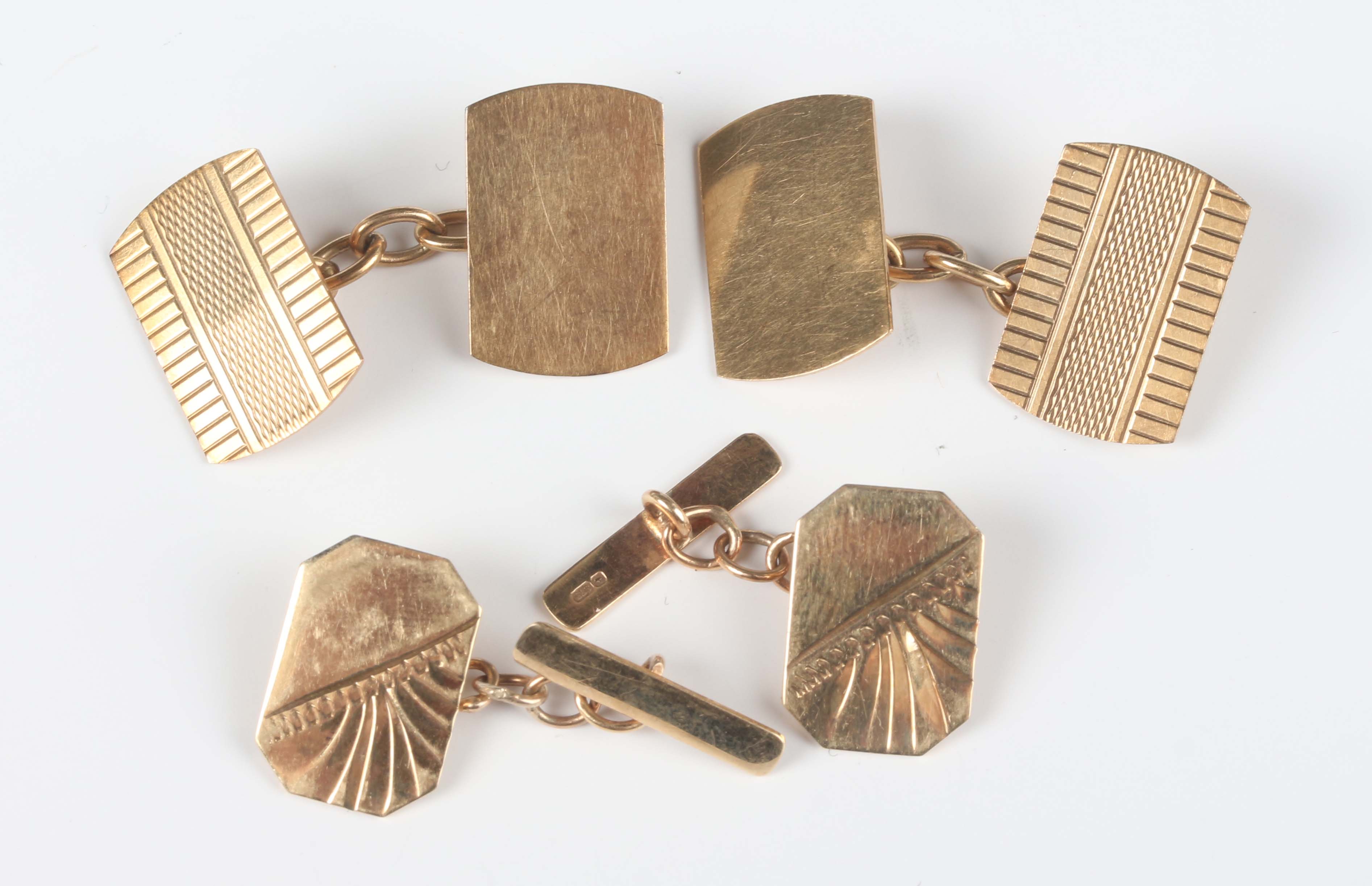 A pair of 9ct gold curved rectangular cufflinks with engraved fronts and plain backs, Birmingham 1970, and another pair of 9ct gold cufflinks with cut cornered rectangular fronts and plain bar fittings to the backs, Birmingham 1991, total weight 6.5g.