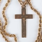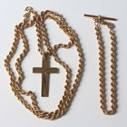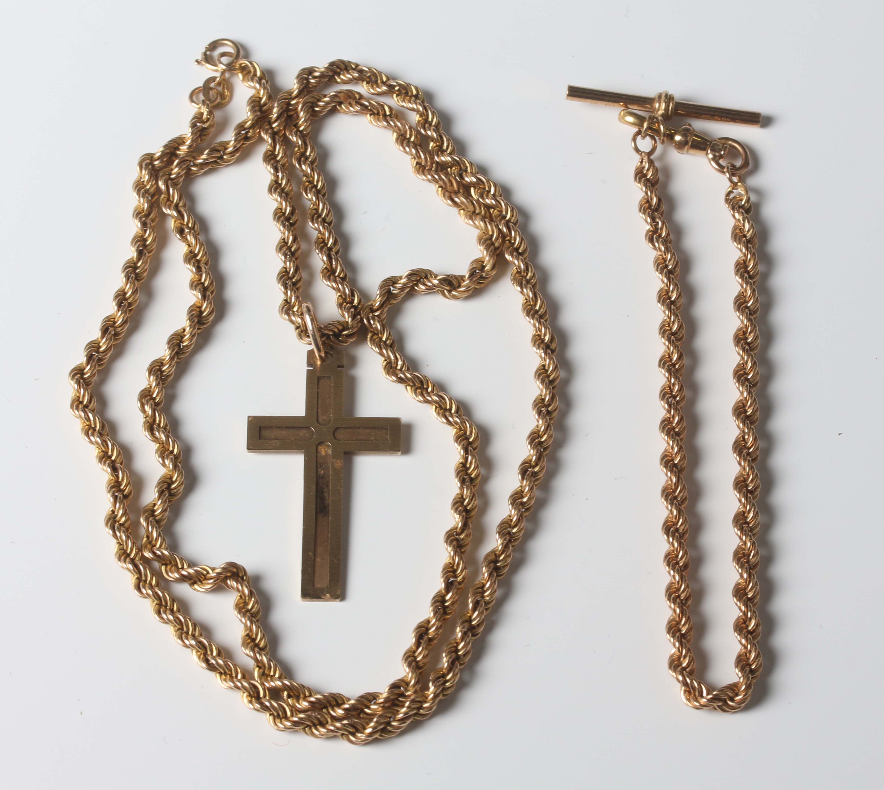 An Italian gold ropetwist link neckchain on a boltring clasp, detailed '9kt', length 63cm, a similar gold ropetwist link bracelet, fitted with a swivel, unmarked, and 9ct gold T-bar, length 20cm, and a 9ct gold pendant cross, length 4.2cm, total weight 14.7cm.