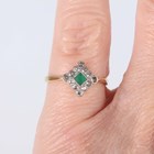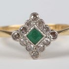 A gold, emerald and diamond square cluster ring, mounted with the square cut emerald within a surround of twelve circular cut diamonds, detailed '18ct', weight 1.7g, ring size approx K1/2, with a case.