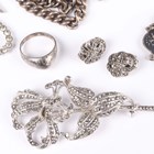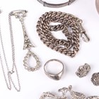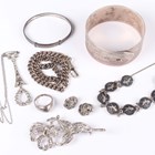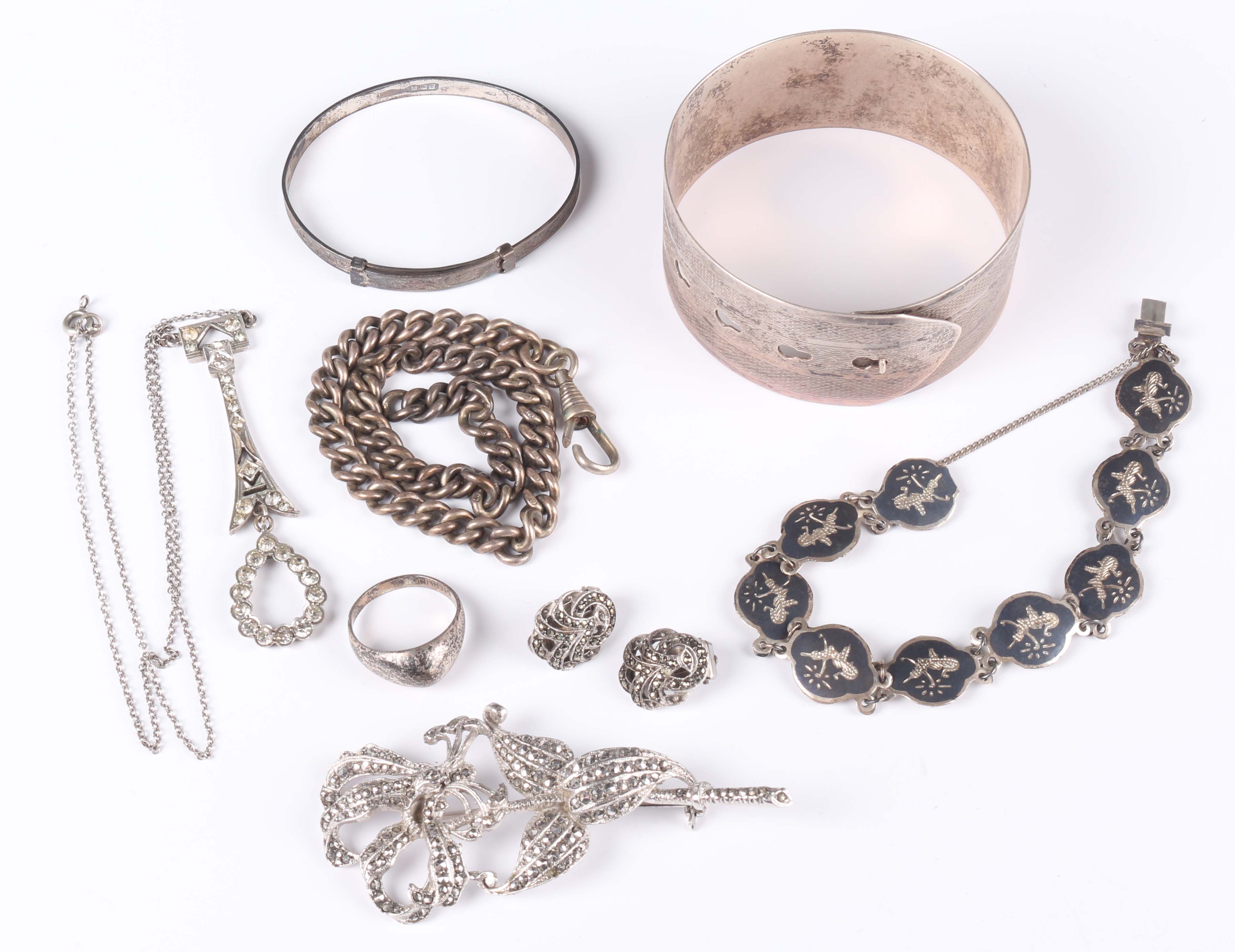 A group of silver jewellery, comprising a wide bangle, Chester 1946, a child's bangle, a Siamese niello decorated bracelet, a marcasite floral spray brooch, a pair of marcasite earclips, a ring, detailed 'Sterling', a colourless paste pendant necklace and a silver curblink Albert watch chain, fitted with a base metal swivel.