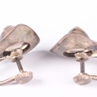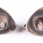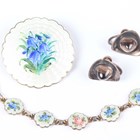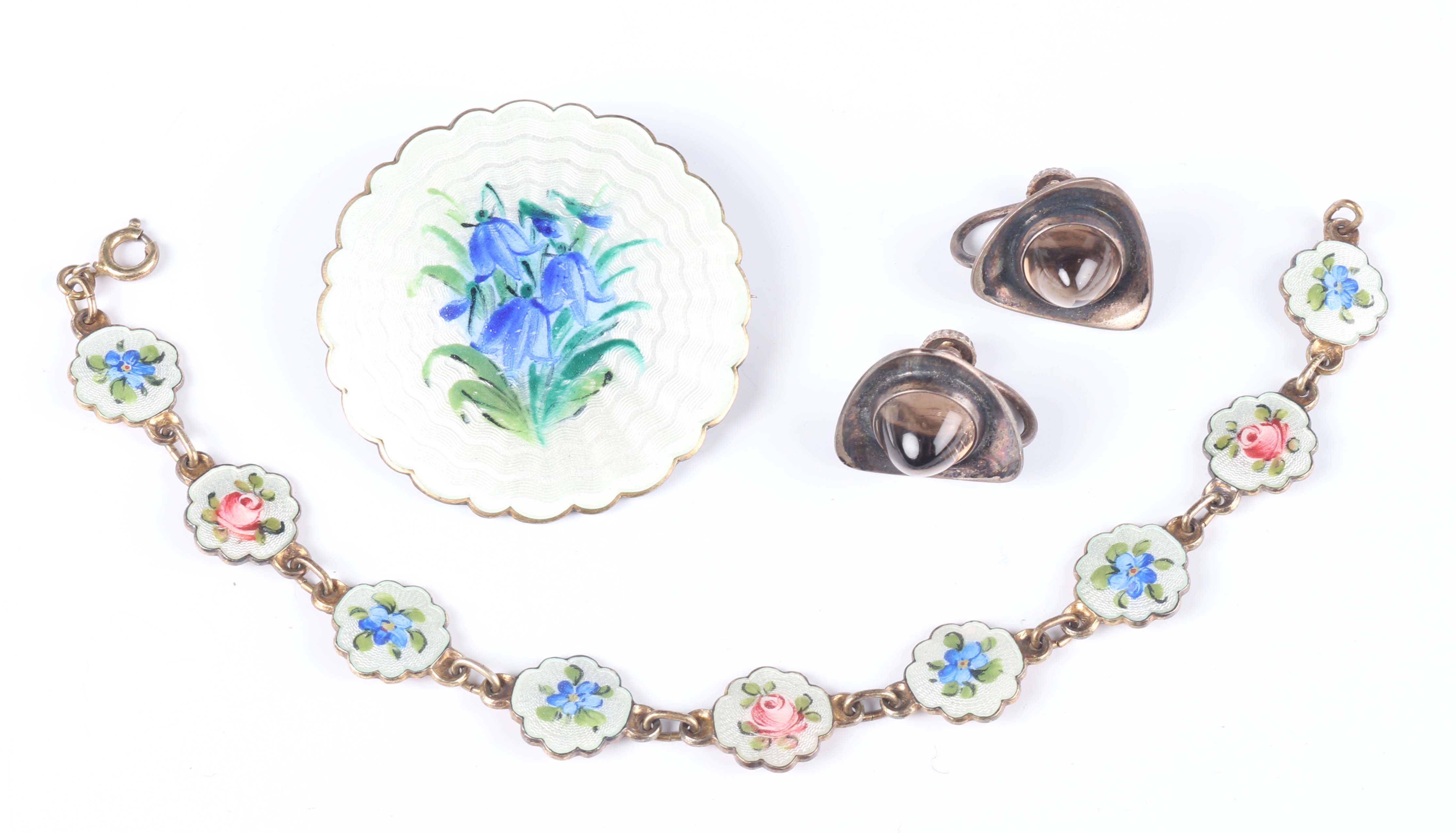 A Norwegian silver gilt and floral enamelled shaped circular link bracelet by Ivar T. Holth, detailed 'Sterling Norway', a matching shaped circular silver gilt and enamelled brooch, decorated with blue flowers, and a pair of silver and smoky quartz earclips, each with a triangular front set with a cabochon smoky quartz, with screw fittings.