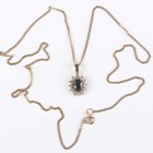 A gold, sapphire and colourless paste set pendant, unmarked, weight 1.2g, length 1.8cm, and a gold curblink neckchain on a boltring clasp, detailed '9K', length 47.5cm, total weight 3.4g.