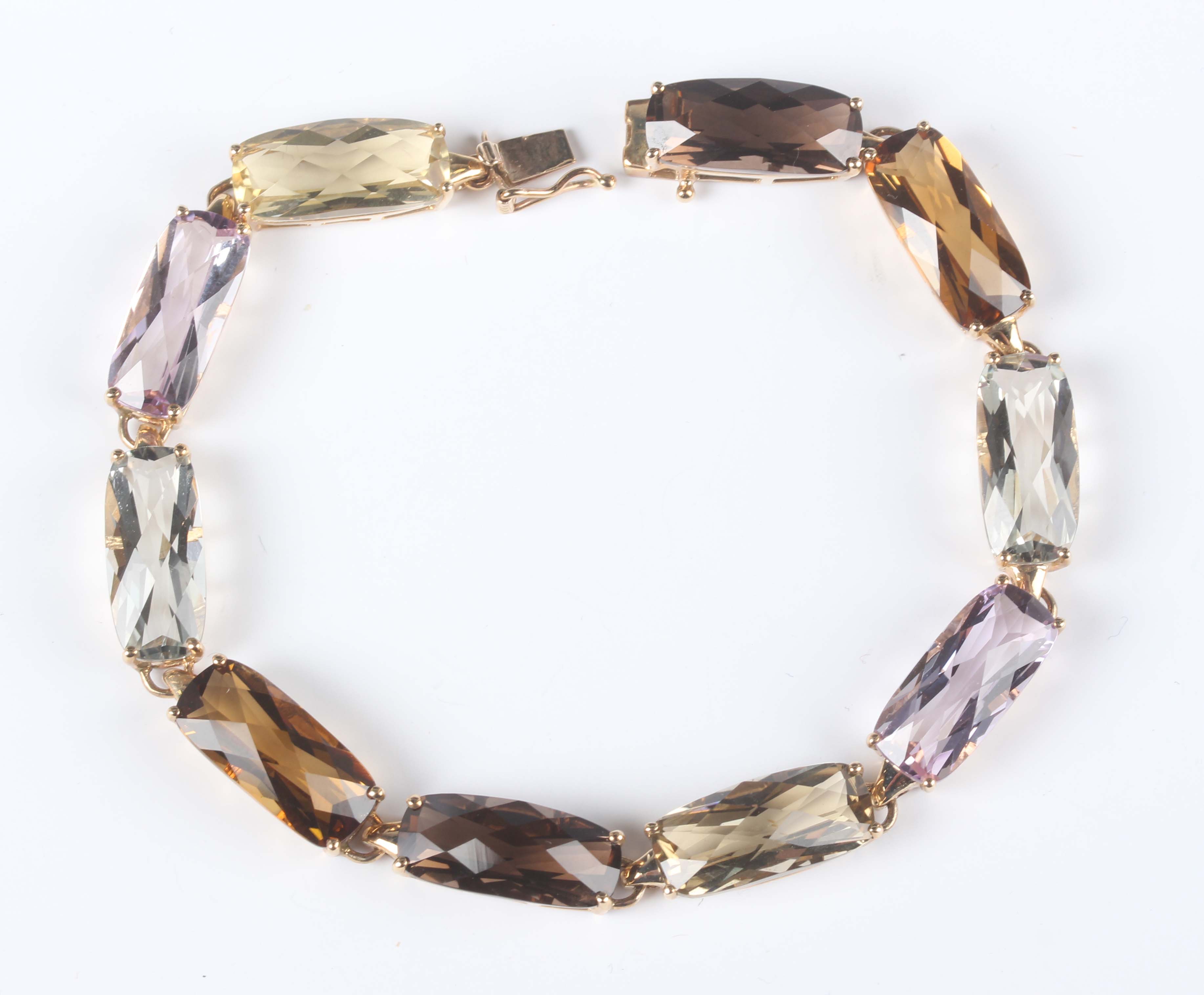 A 9ct gold and varicoloured gemstone bracelet, claw set with amethyst, green quartz and smoky quartz, detailed ‘375’, on a snap clasp, weight 16g, length 19cm, with a case.