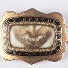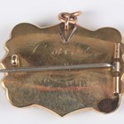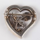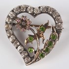 A Victorian gold and black enamelled shaped rectangular mourning brooch, the front glazed with a hair locket compartment, framed by an inscription 'In Memory of My Dear Father', weight 11g, width 3.6cm, and a French green, pink and colourless paste set heart shaped witch's brooch with a floral centre, weight 6g, width 2.3cm.