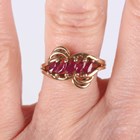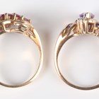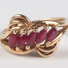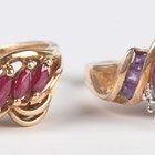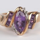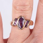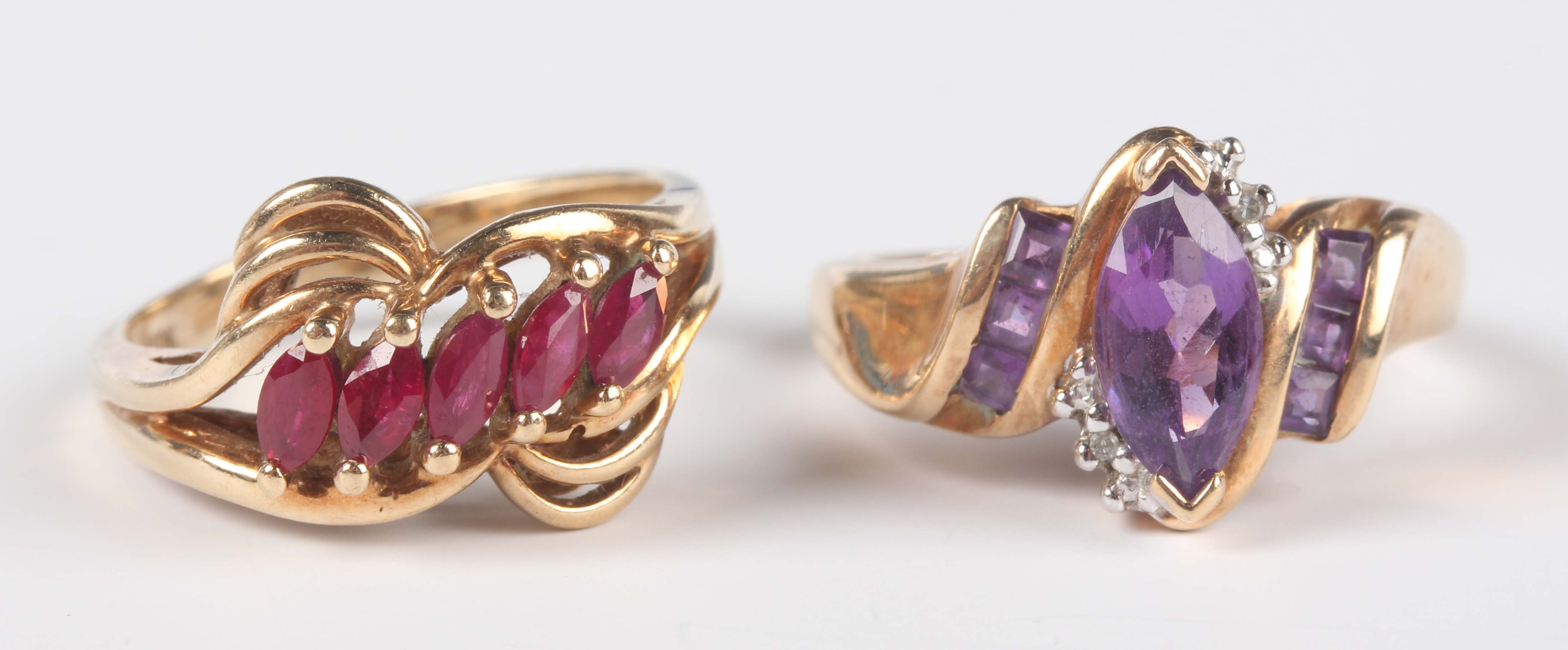 A gold, amethyst and diamond ring, mounted with the marquise shaped amethyst between two diamonds and square cut amethyst three stone shoulders in a twistover design, detailed ‘10K’, ring size approx N, and a gold ring, mounted with a row of five marquise shaped rubies, detailed ‘10K’, ring size approx M1/2, total weight 7g.