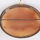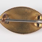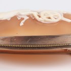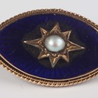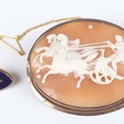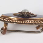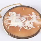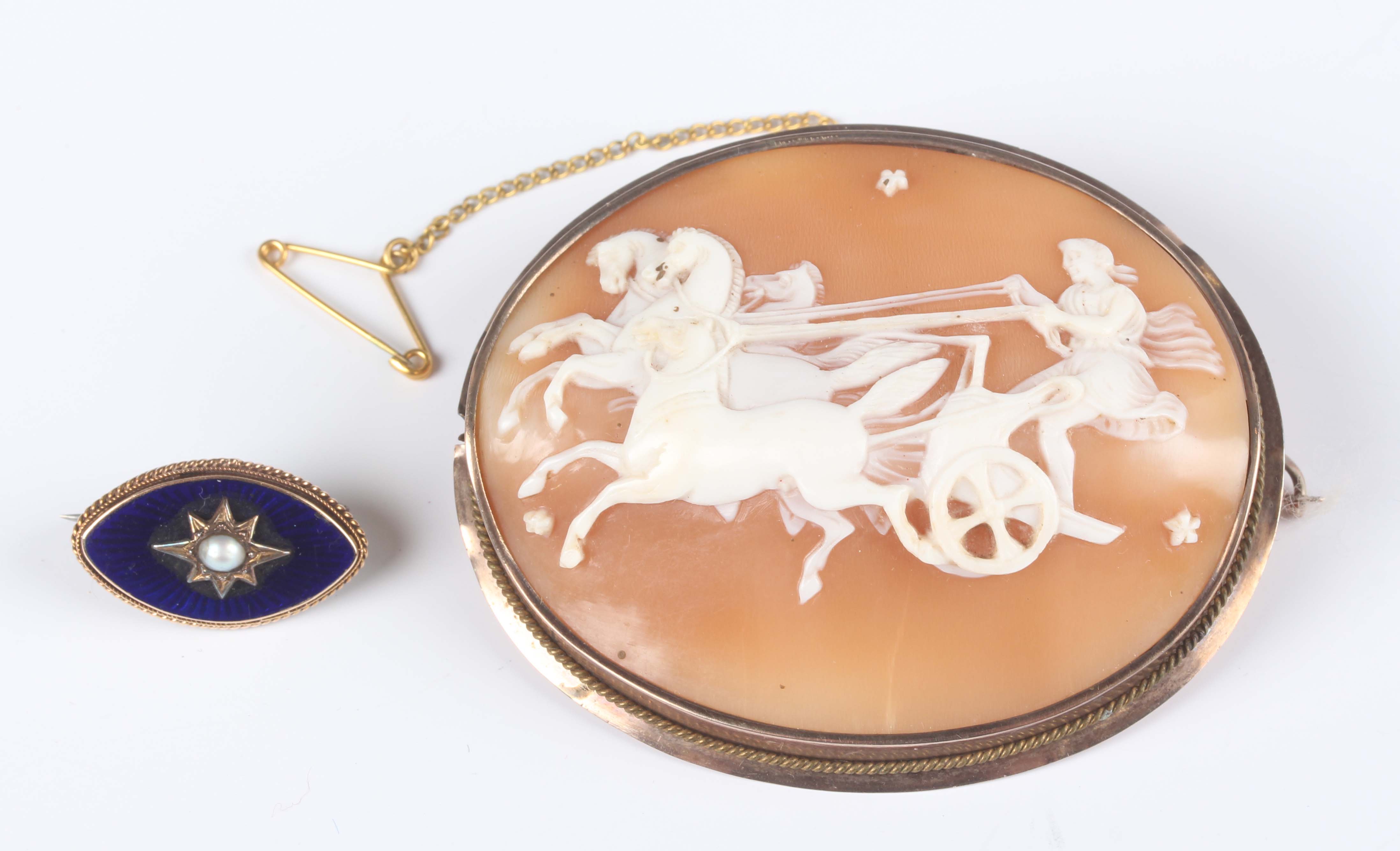 A Victorian gold mounted oval shell cameo brooch, carved as a three horse-drawn chariot in the classical taste, unmarked, weight 17.7g, width 6cm, and a gilt metal, blue enamelled and half-pearl set marquise shaped brooch, width 2.2cm.