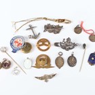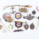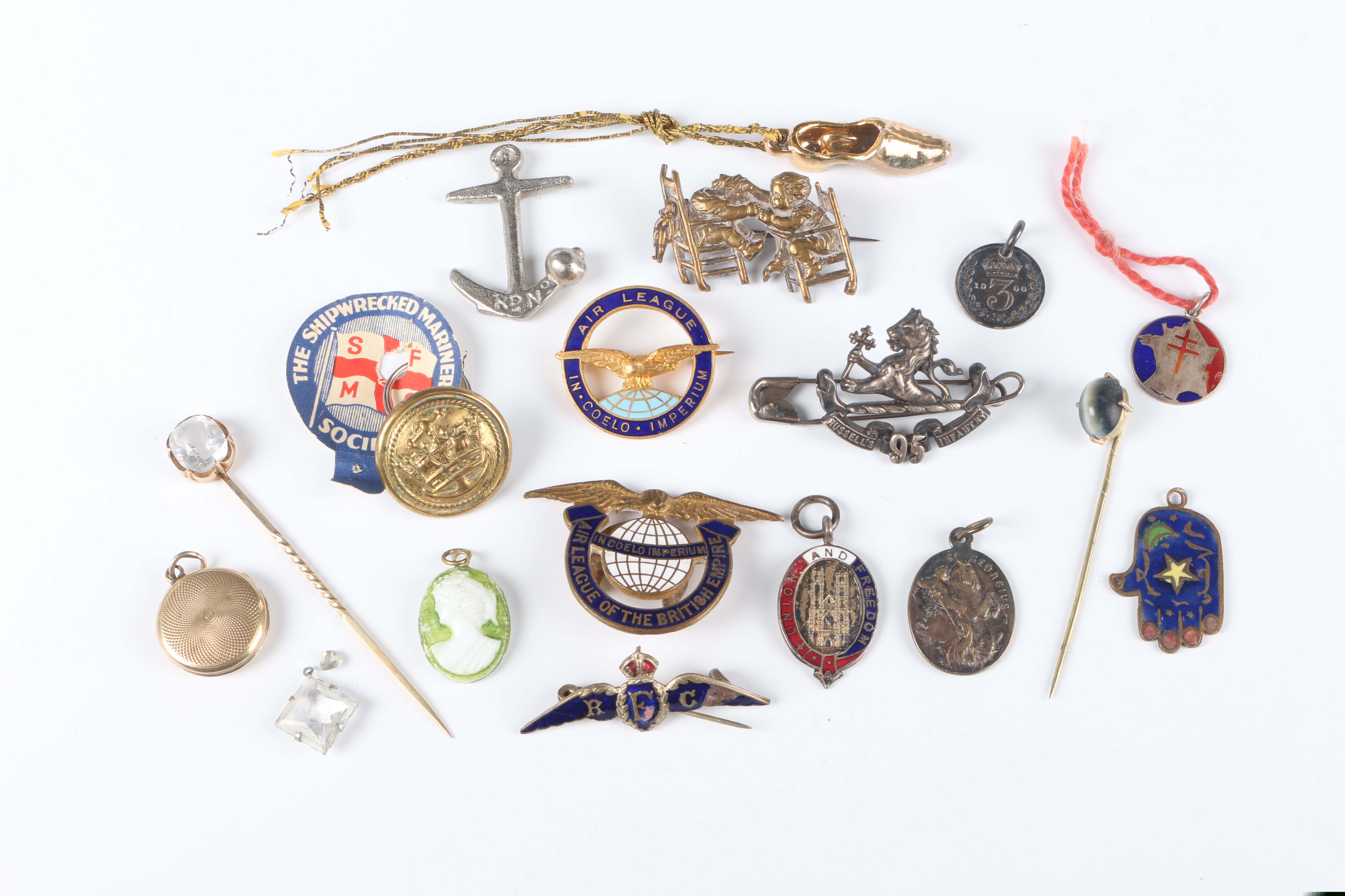 A group of jewellery, including two gem set stickpins, a Victorian circular pendant locket, glazed with the photograph of a dog, a brooch, designed as two babies fighting, three further brooches, an Indian Army collar badge, detailed ’95 Russell’s Infantry’, and six pendants and charms.