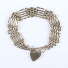 A 9ct gold bar and oval link gate bracelet on a 9ct gold heart shaped padlock clasp, weight 18.3g, length 20cm.