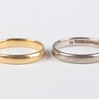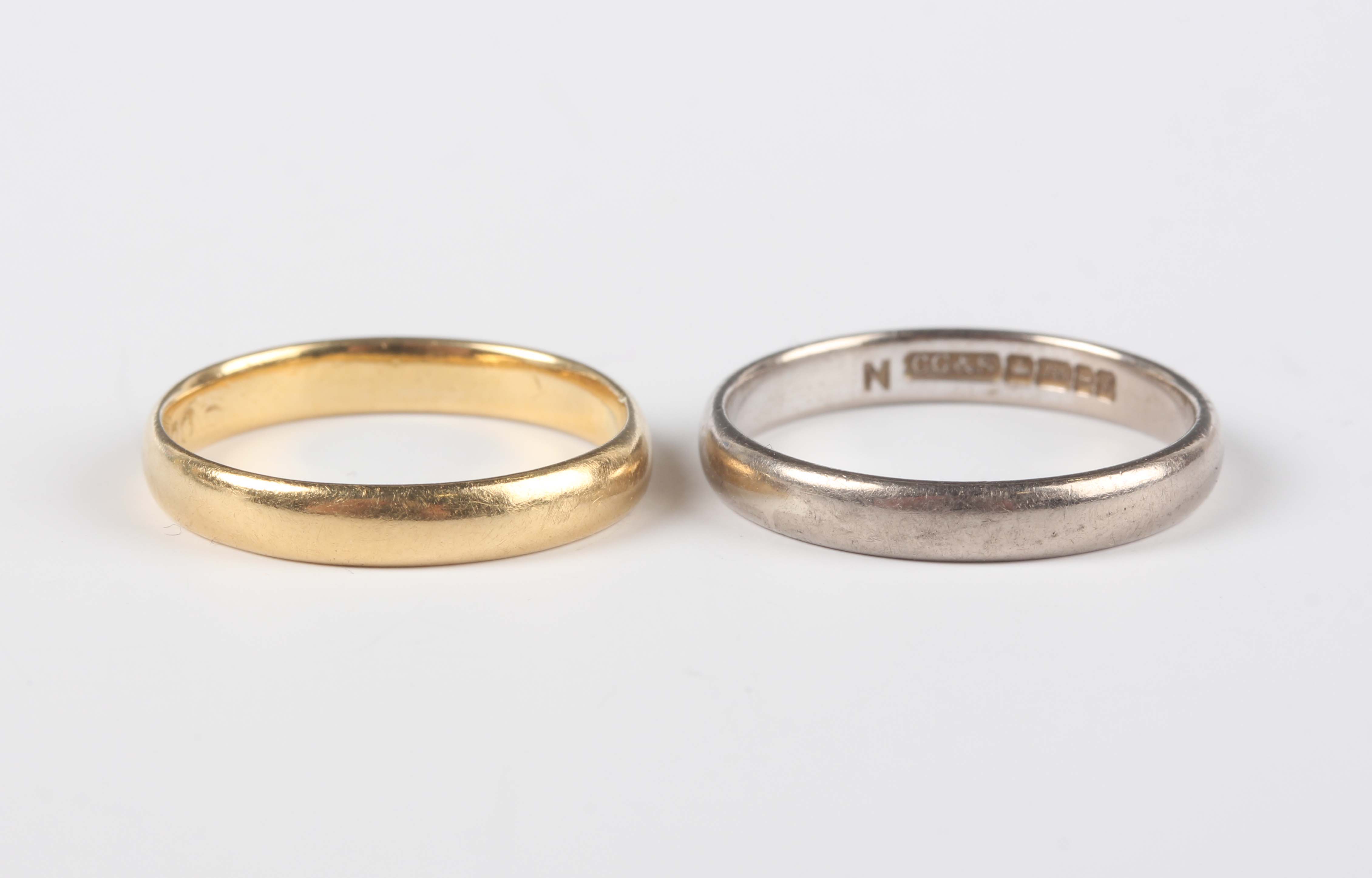 An 18ct gold plain wedding ring, weight 2.4g, ring size approx M, and an 18ct white gold plain wedding ring, weight 2.9g, ring size approx N.