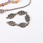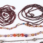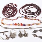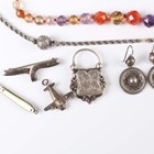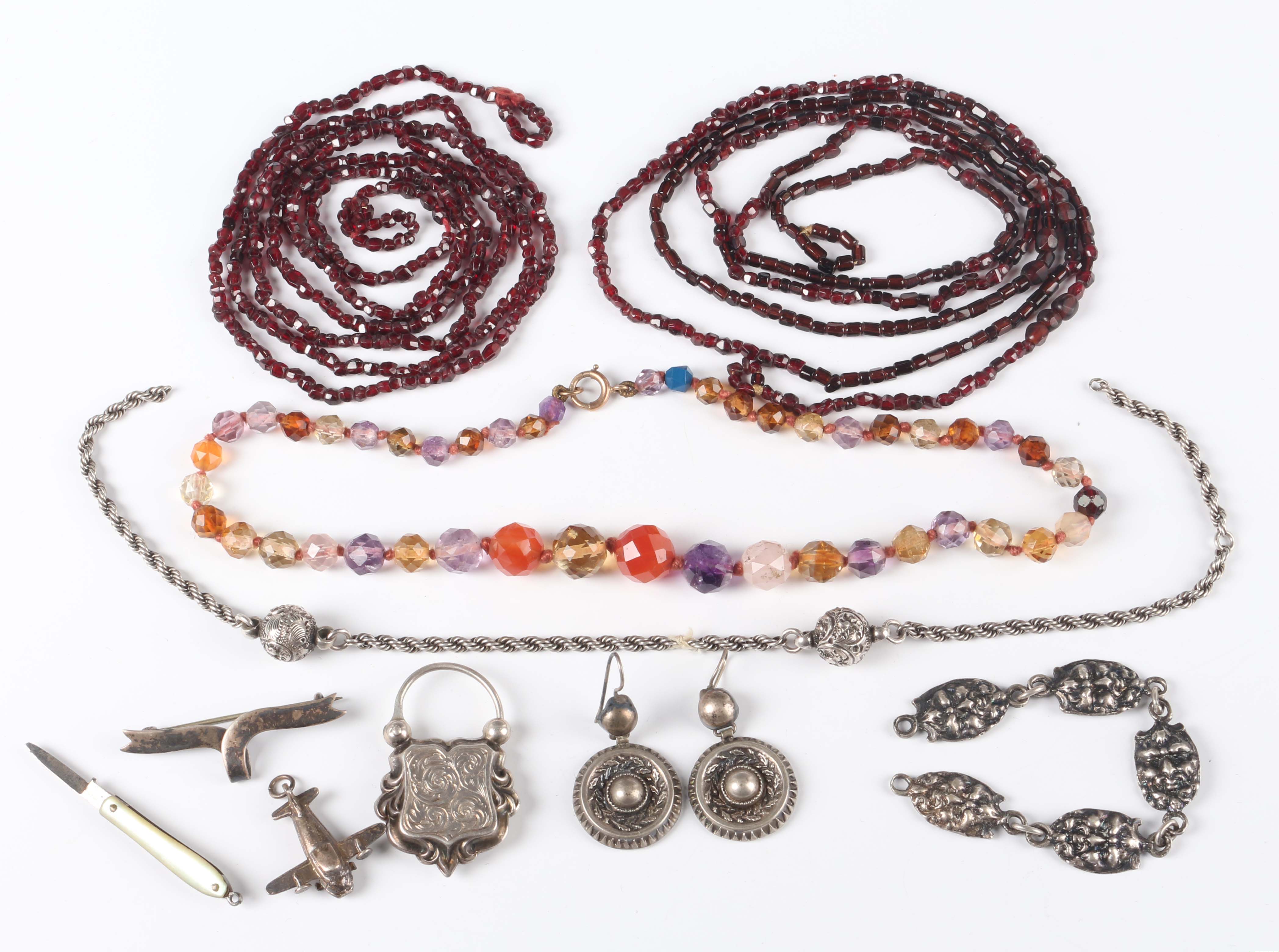 A group of Victorian and later jewellery, comprising a single row necklace of varicoloured quartz and cornelian graduated faceted beads, length 36.5cm, a single row necklace of faceted garnet beads with loop form terminals, a single row necklace of garnet and red glass beads with loop form terminals, a steel bladed and mother-of-pearl miniature folding knife, a pair of Victorian pendant earrings, a padlock shaped clasp, a watch brooch, Chester 1910, an aeroplane charm, a row of five masks and a length of ropetwist chain with two bead divisions at intervals.