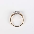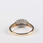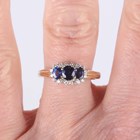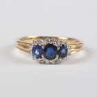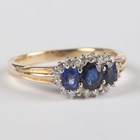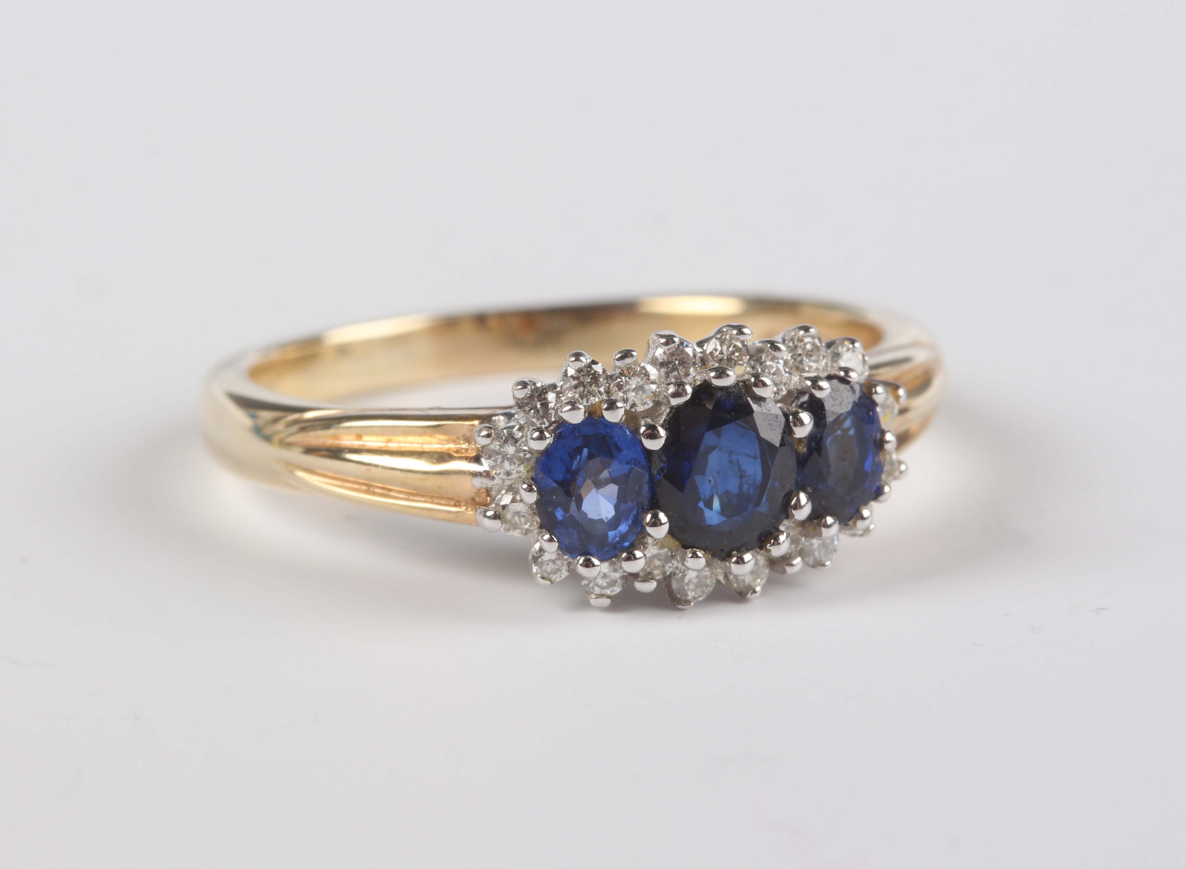 A 9ct gold, sapphire and diamond ring, claw set with a row of three oval cut sapphires within a surround of circular cut diamonds, weight 2.8g, ring size approx O1/2.