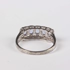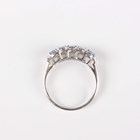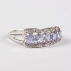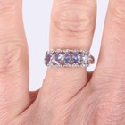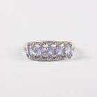 A white gold, tanzanite and diamond half hoop ring, claw set with a row of five oval cut tanzanites between two rows of five small diamonds, detailed ‘375’, weight 2.9g, ring size approx O.