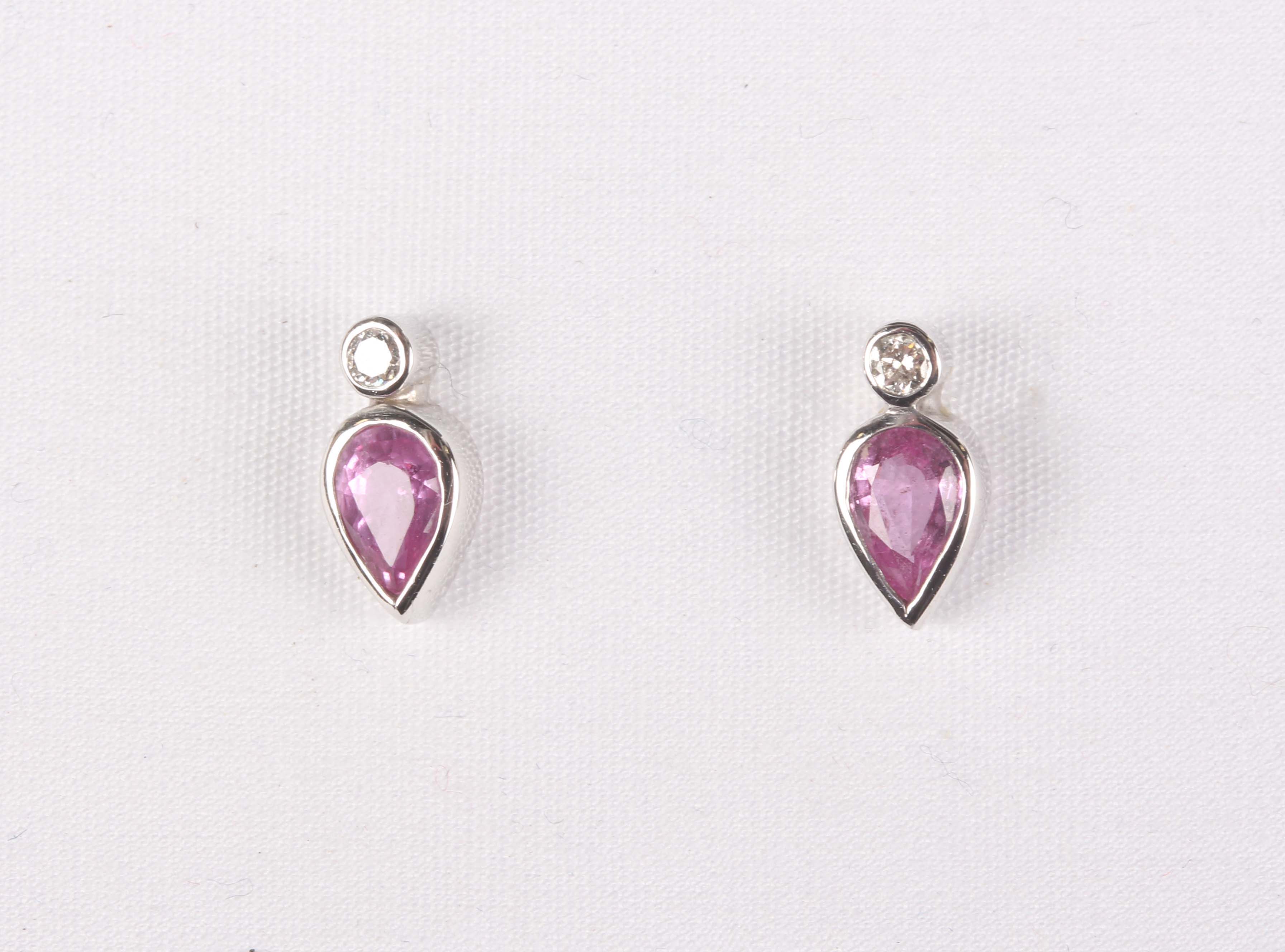 A pair of 9ct white gold, diamond and pink sapphire earstuds, each mounted with a circular cut diamond above a pear shaped pink sapphire, with post and white gold butterfly fittings, detailed ‘375’, total weight 2g, length 1cm, with a case.