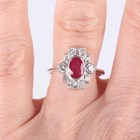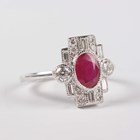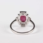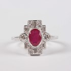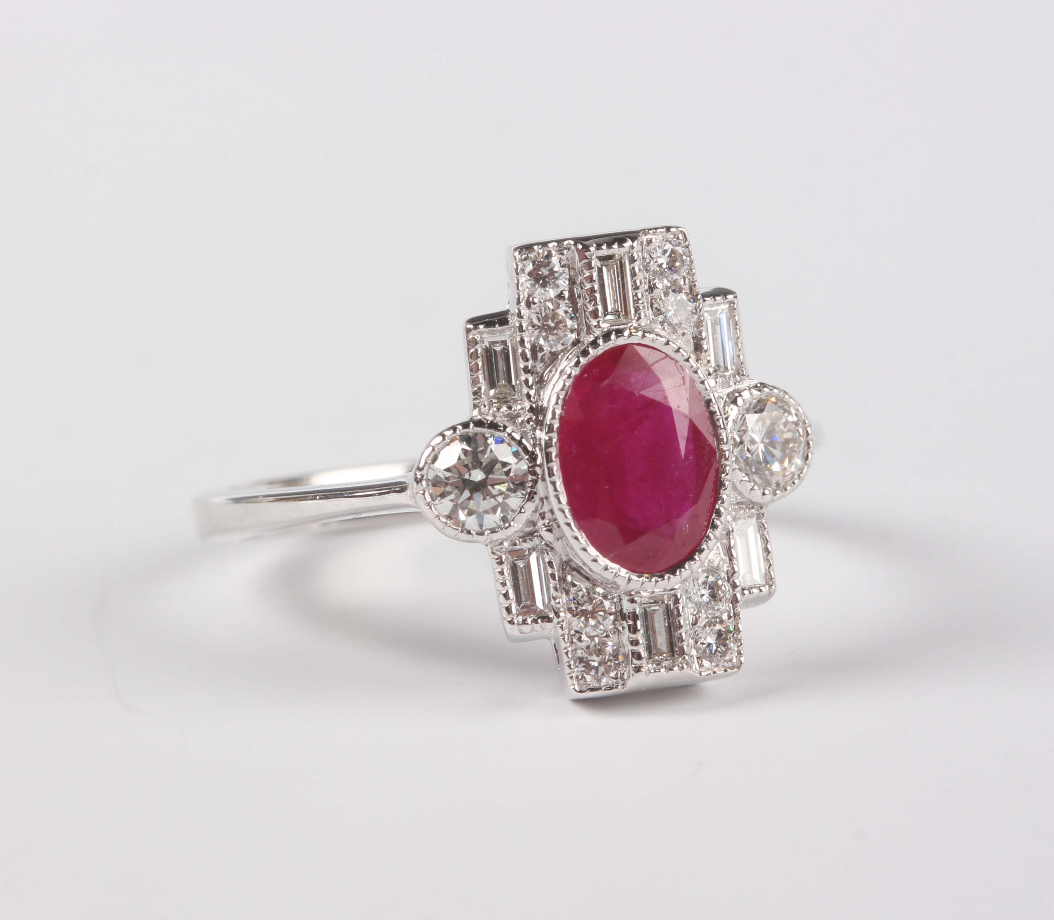 A white gold, ruby and diamond panel shaped ring, collet set with an oval cut ruby between two principal round brilliant cut diamonds, otherwise set with baguette cut and round brilliant cut diamonds, detailed '750', weight 3.3g, ruby weight approx 0.83ct, total diamond weight approx 0.55ct, ring size approx O1/2.