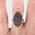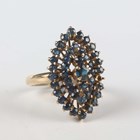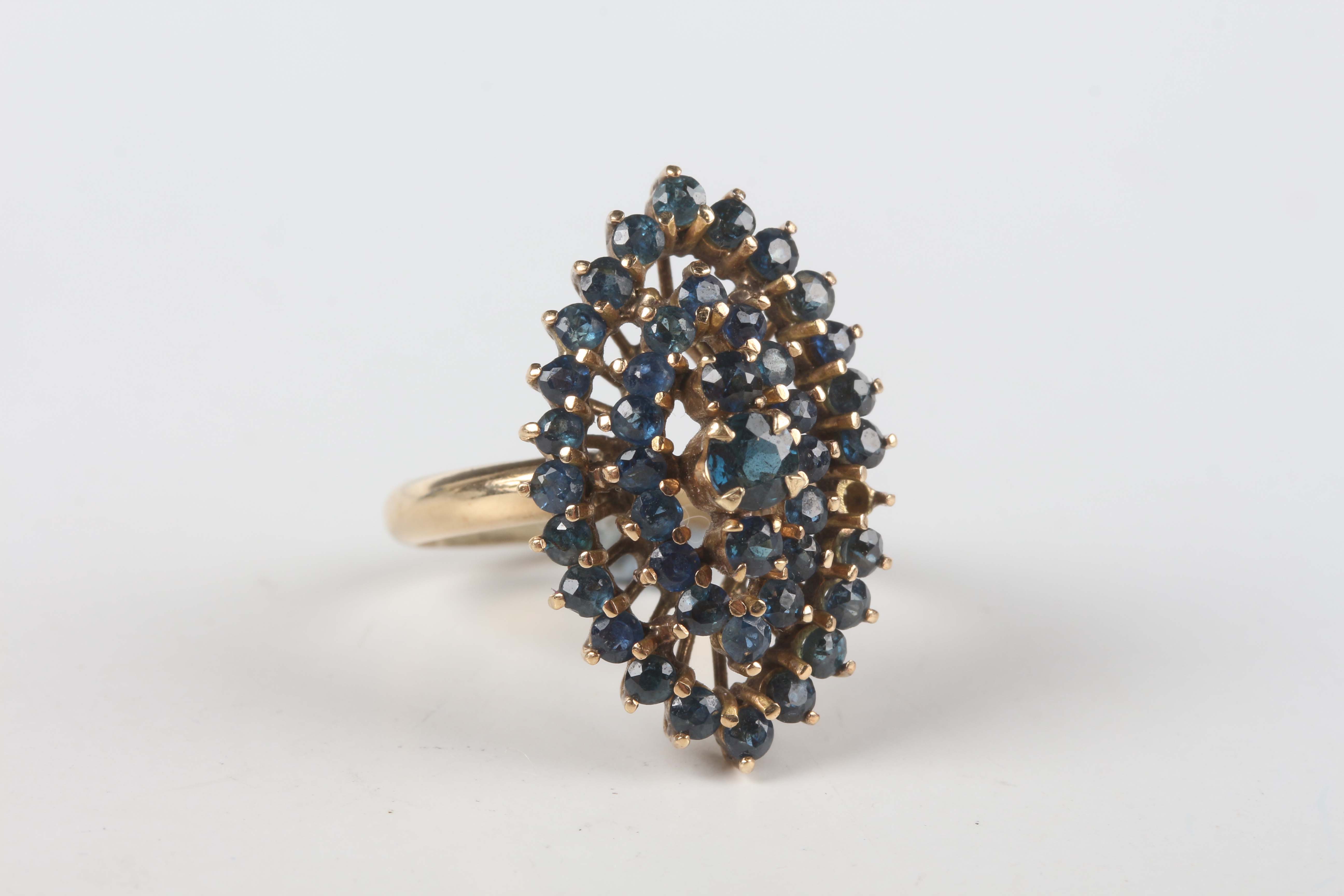A gold and sapphire marquise shaped cluster ring, mounted with circular cut sapphires with the principal sapphire at the centre, detailed ‘18K’, weight 5.2g, ring size approx O1/2 (one small sapphire lacking).