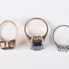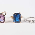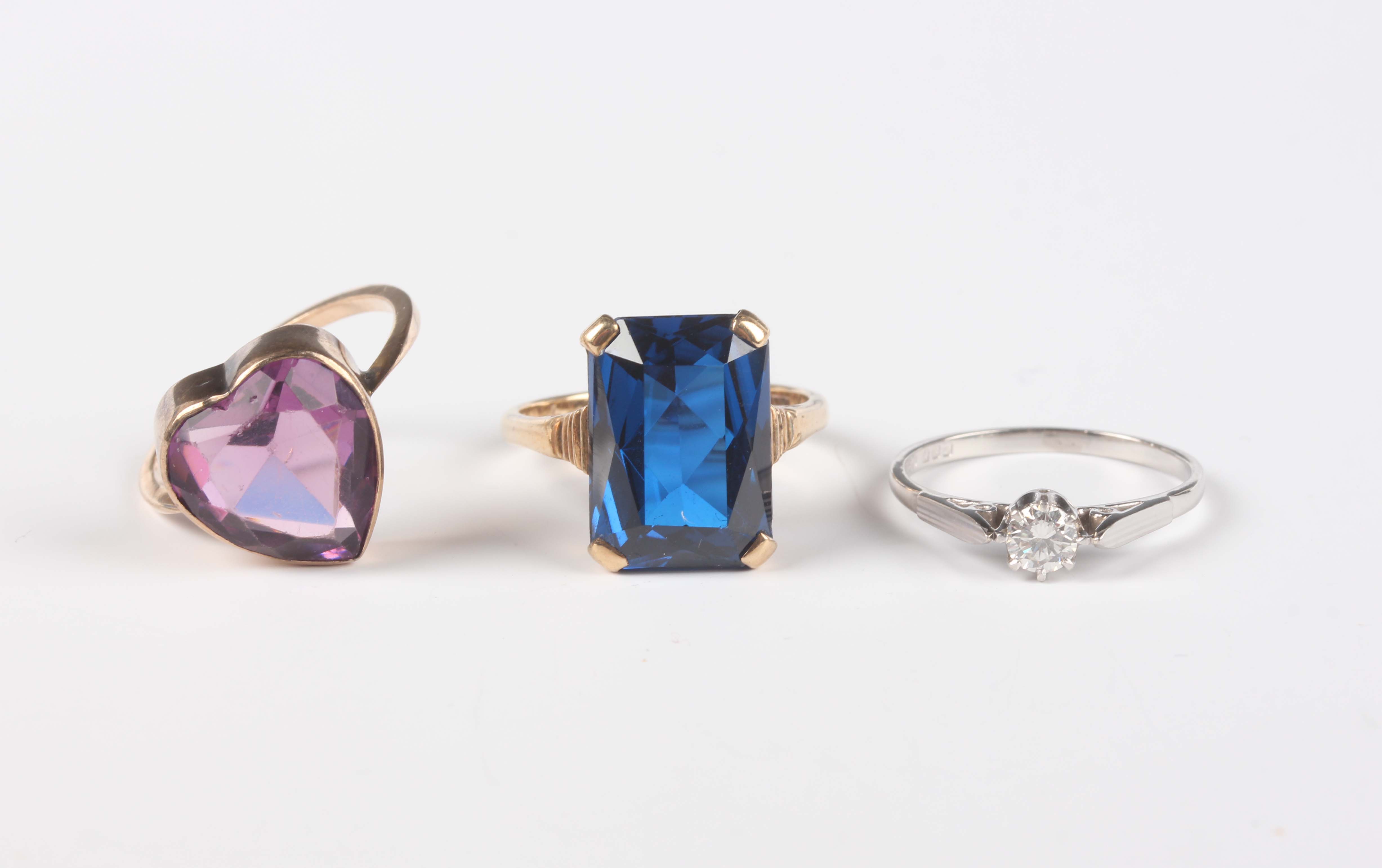 A platinum and diamond single stone ring, claw set with a circular cut diamond, weight 2.2g, ring size approx K1/2, a gold ring, mounted with a heart shaped amethyst, detailed ‘9ct’, ring size approx K1/2, and a 9ct gold and cut cornered rectangular blue gem set single stone ring, Birmingham 1970, ring size approx K, total weight 7.1g.