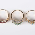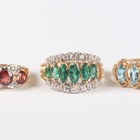 A gold, emerald and diamond ring, claw set with a row of six graduated marquise shaped emeralds at the centre, detailed ‘14K’, ring size approx N1/2 (one emerald lacking), a gold ring, mounted with four circular cut garnets alternating with three pairs of circular cut diamonds, detailed ‘10K’, ring size approx N, and a gold and pale blue topaz five stone ring, claw set with a row of marquise shaped blue topazes, detailed ‘10K’, ring size approx M, total weight 5.5g.