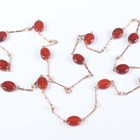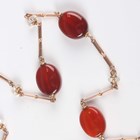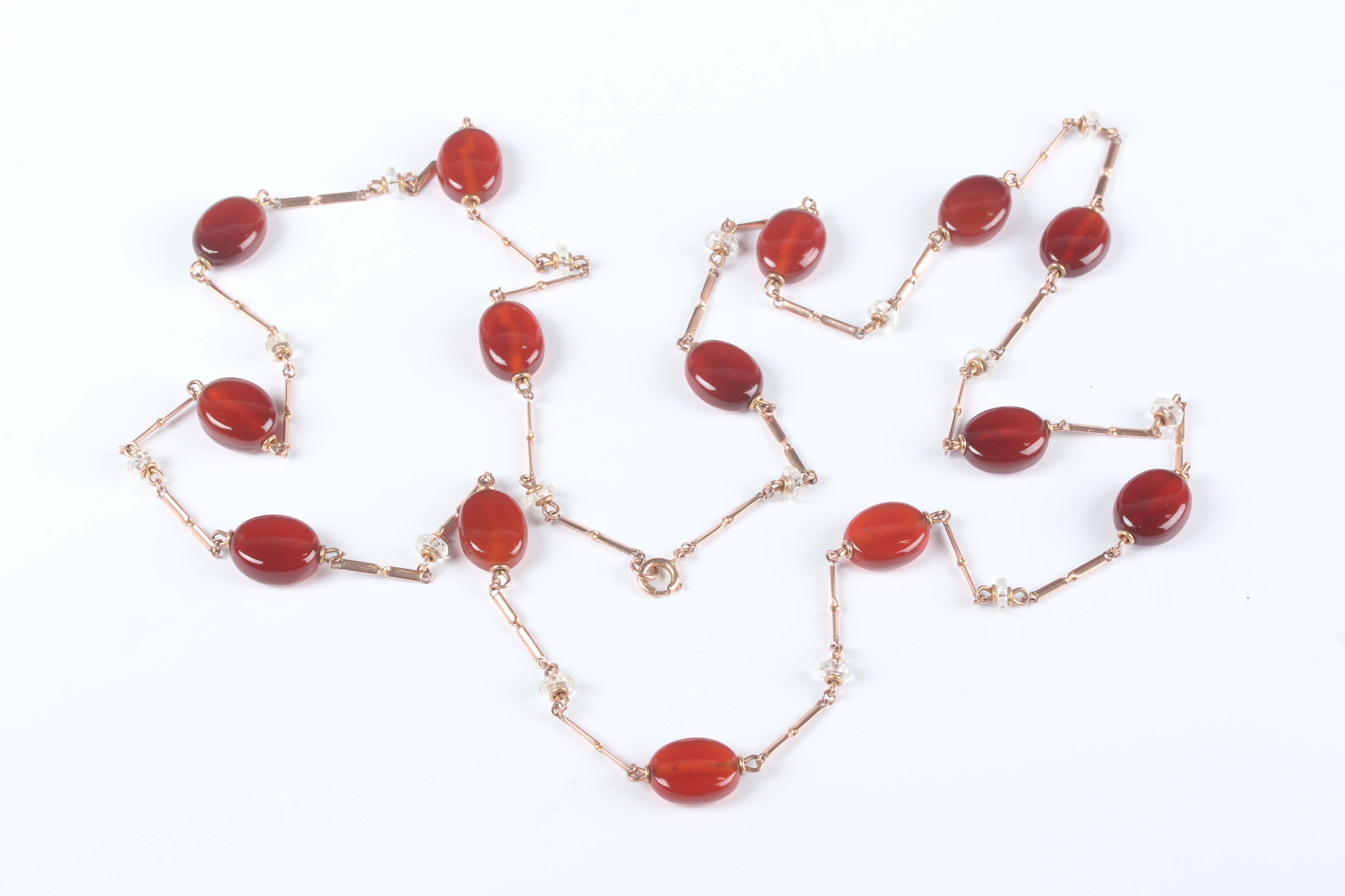 A gold and cornelian necklace in a twisted bar link design, spaced with oval cornelians, on a boltring clasp, detailed ‘9ct’, weight 28.8g, length 89.5g.