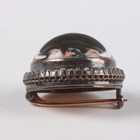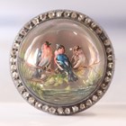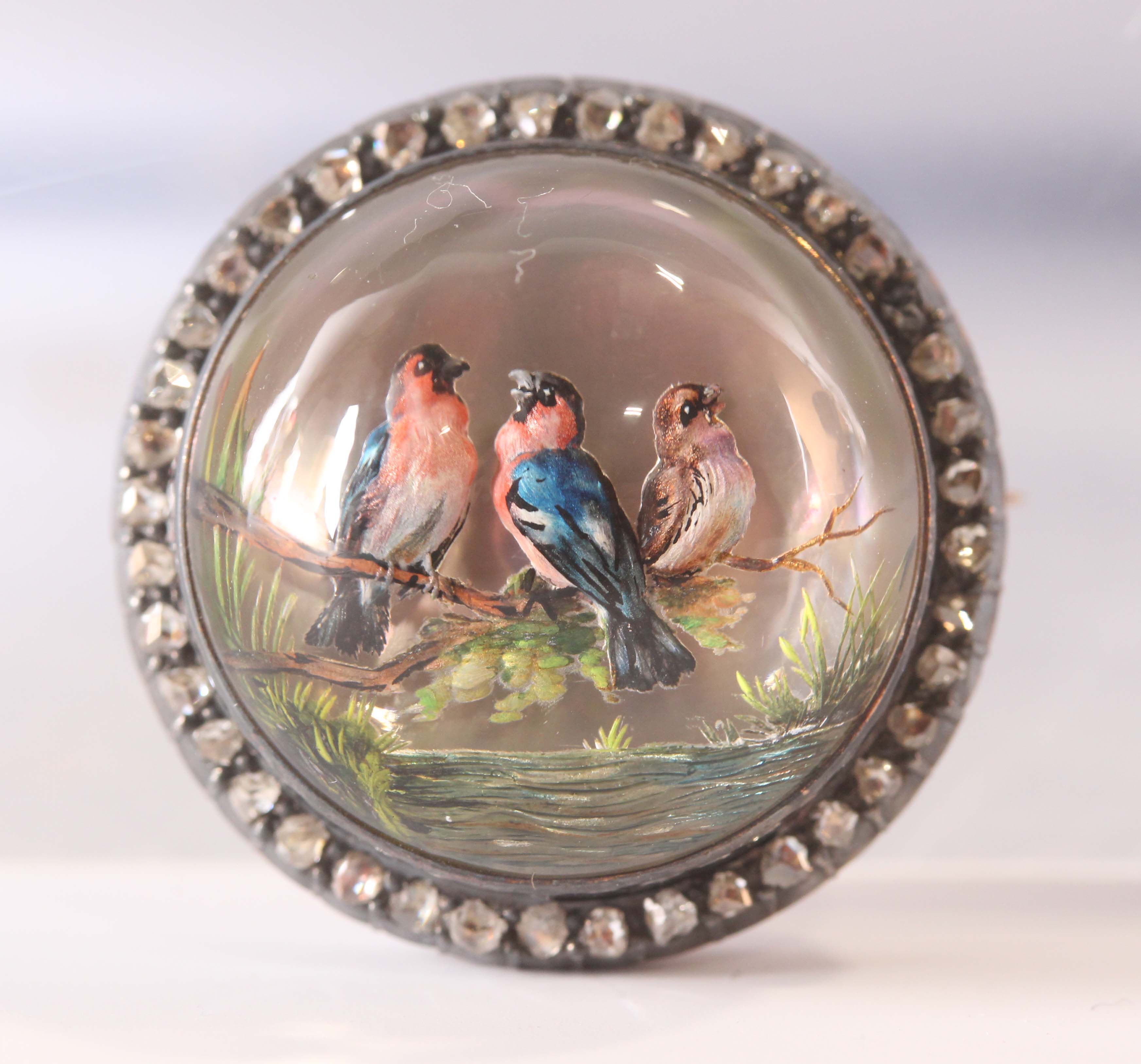 A late Victorian Essex crystal and diamond, gold backed and silver set circular brooch, the carved rock crystal intaglio reverse painted with a scene of three birds perched on a branch above a stream, within a surround of rose cut diamonds, weight 12g, diameter 2.5cm.