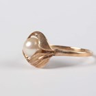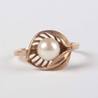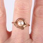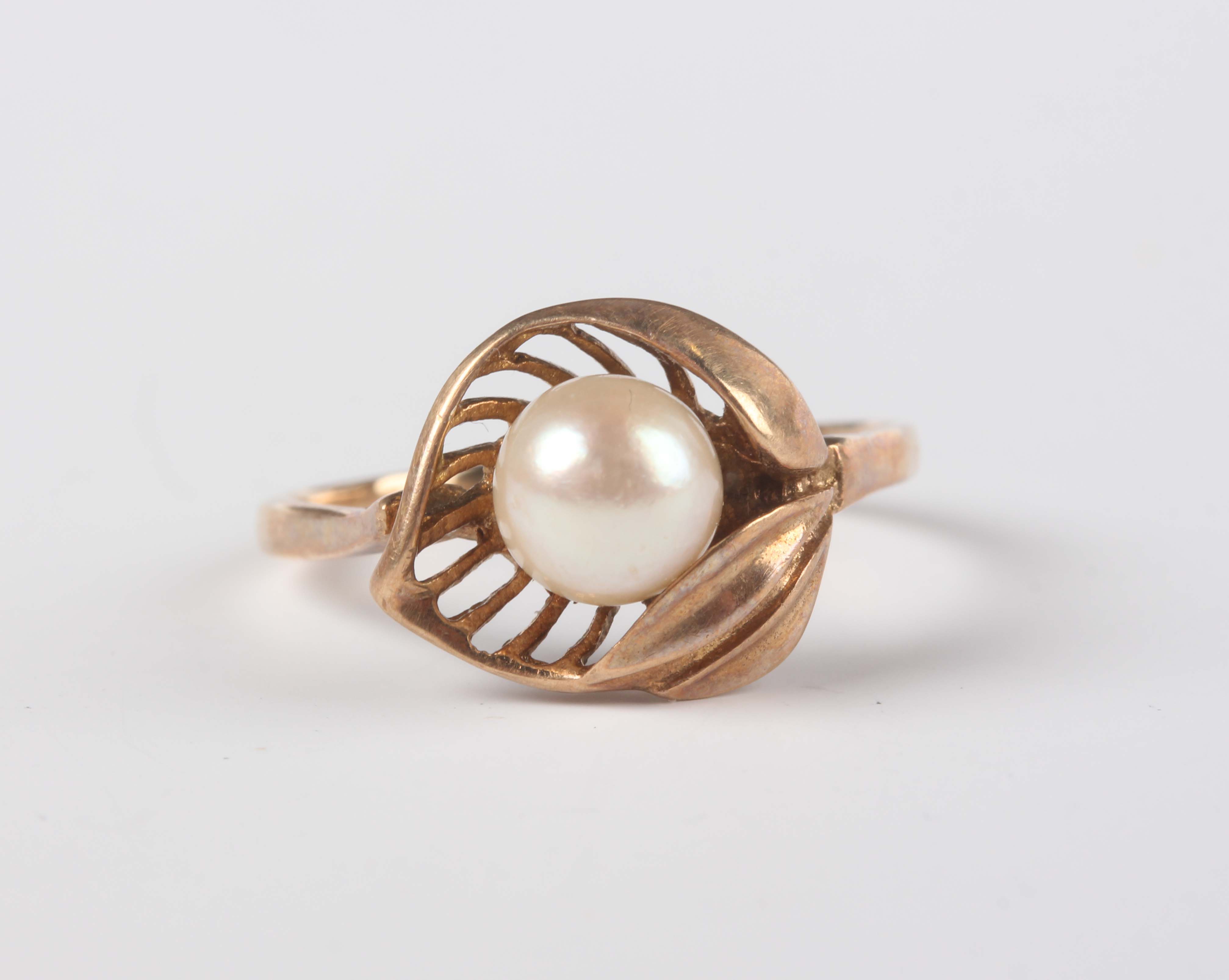 A 9ct gold and cultured pearl ring in a foliate design, detailed '9ct', weight 2.5g, ring size approx P1/2, with a case.