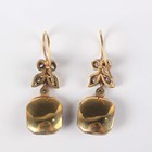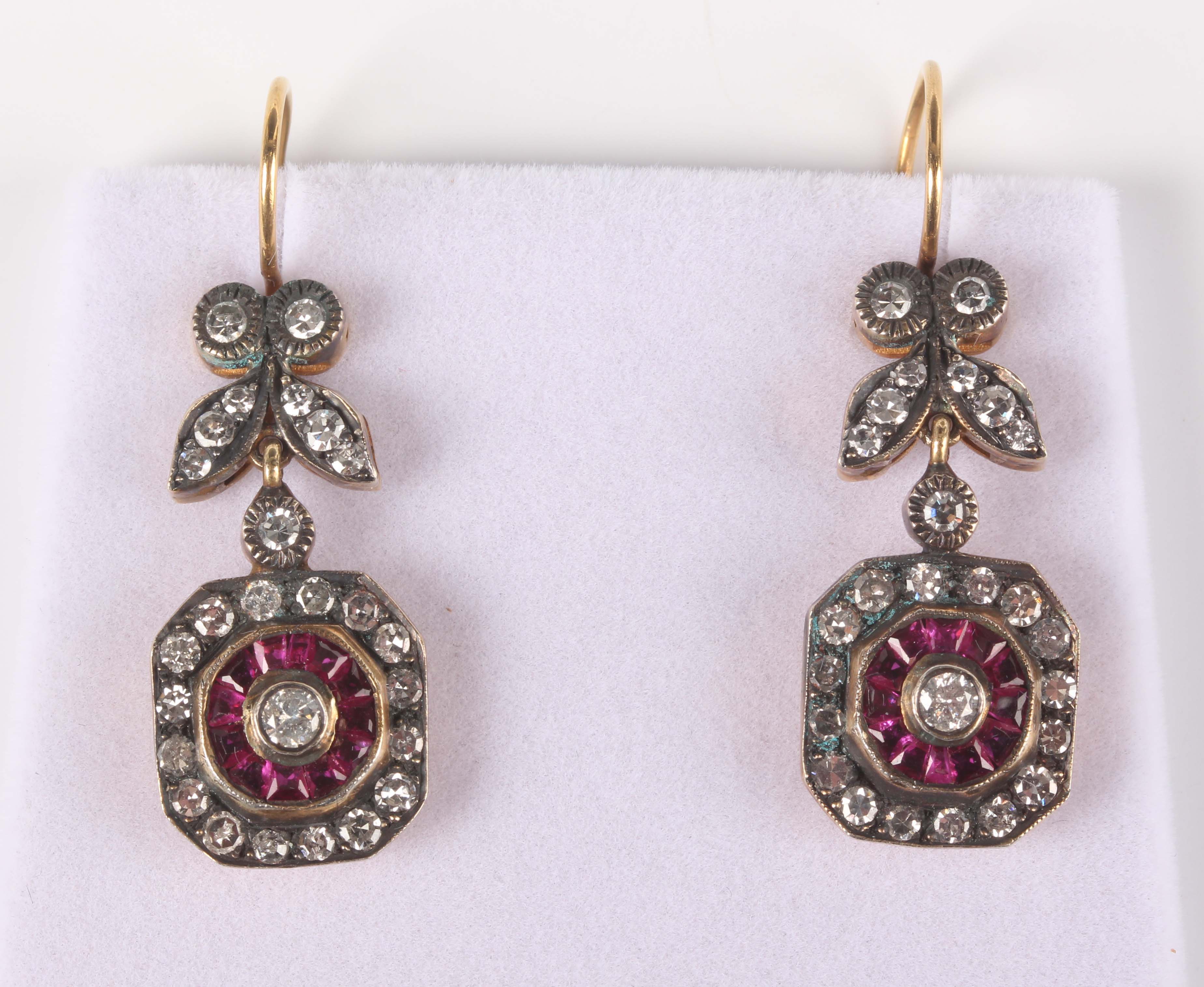 A pair of gold, ruby and diamond pendant cluster earrings, each with a diamond set foliate surmount with hook shaped fittings, unmarked, total weight 9.4g, total diamond weight approx 1.00ct, total ruby weight approx 0.58ct, length 3.9cm, with a case.