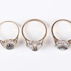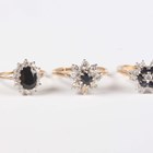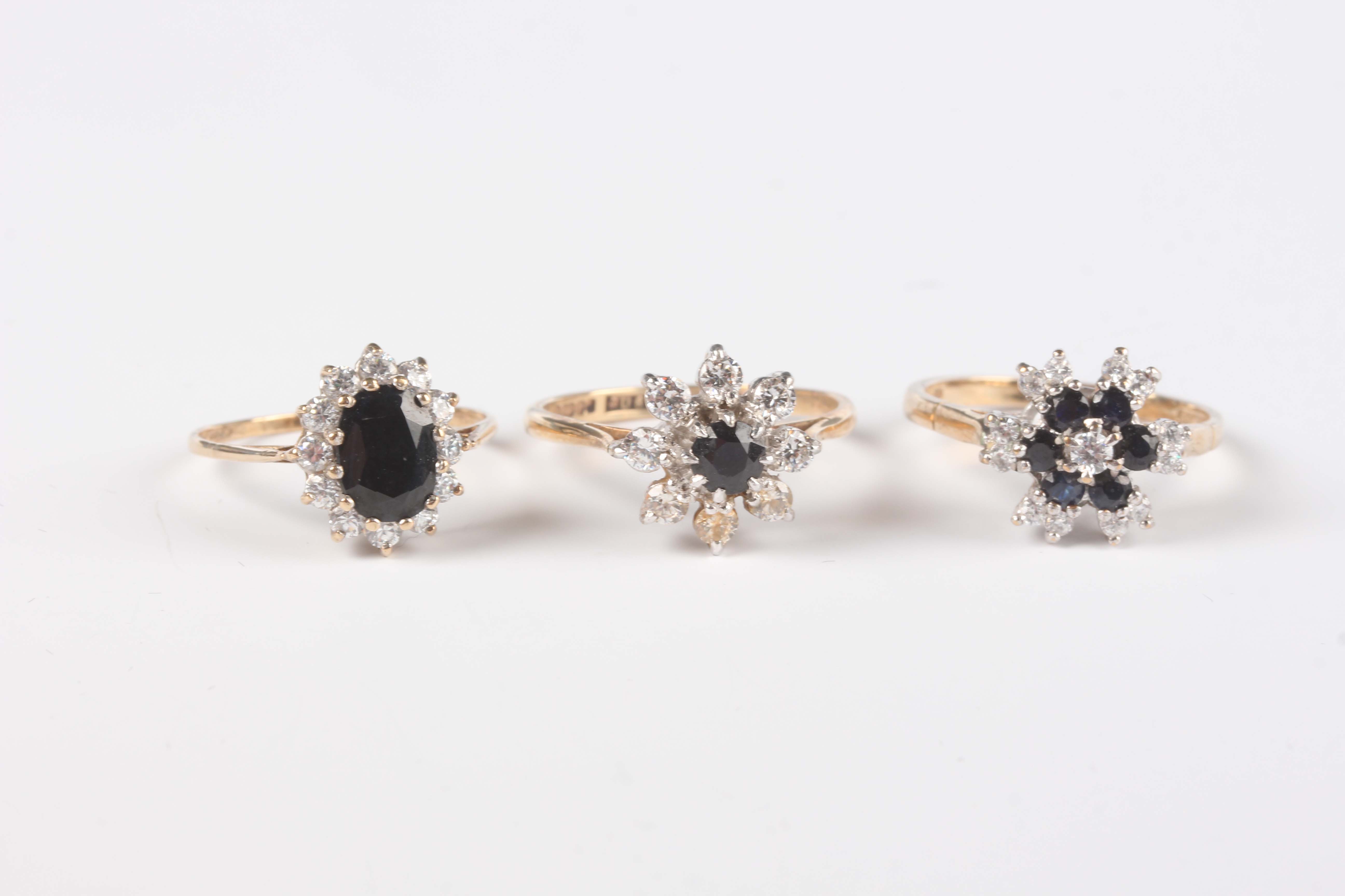 A 9ct gold, sapphire and cubic zirconia cluster ring, ring size approx Q1/2, and two 9ct gold, sapphire and colourless paste cluster rings, total weight 8.2g, with three cases.