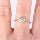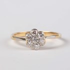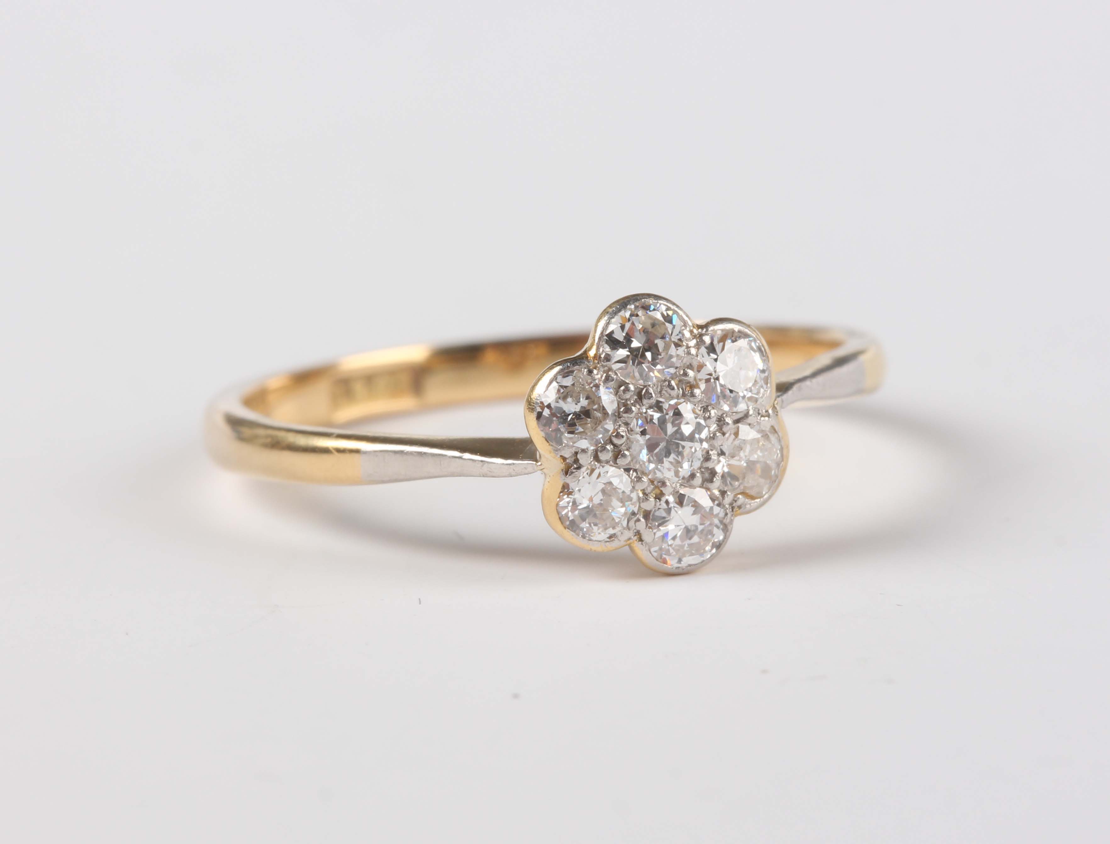 A gold and diamond seven stone cluster ring, mounted with circular cut diamonds, detailed ‘18ct’, weight 2.5g, ring size approx Q.