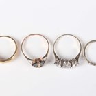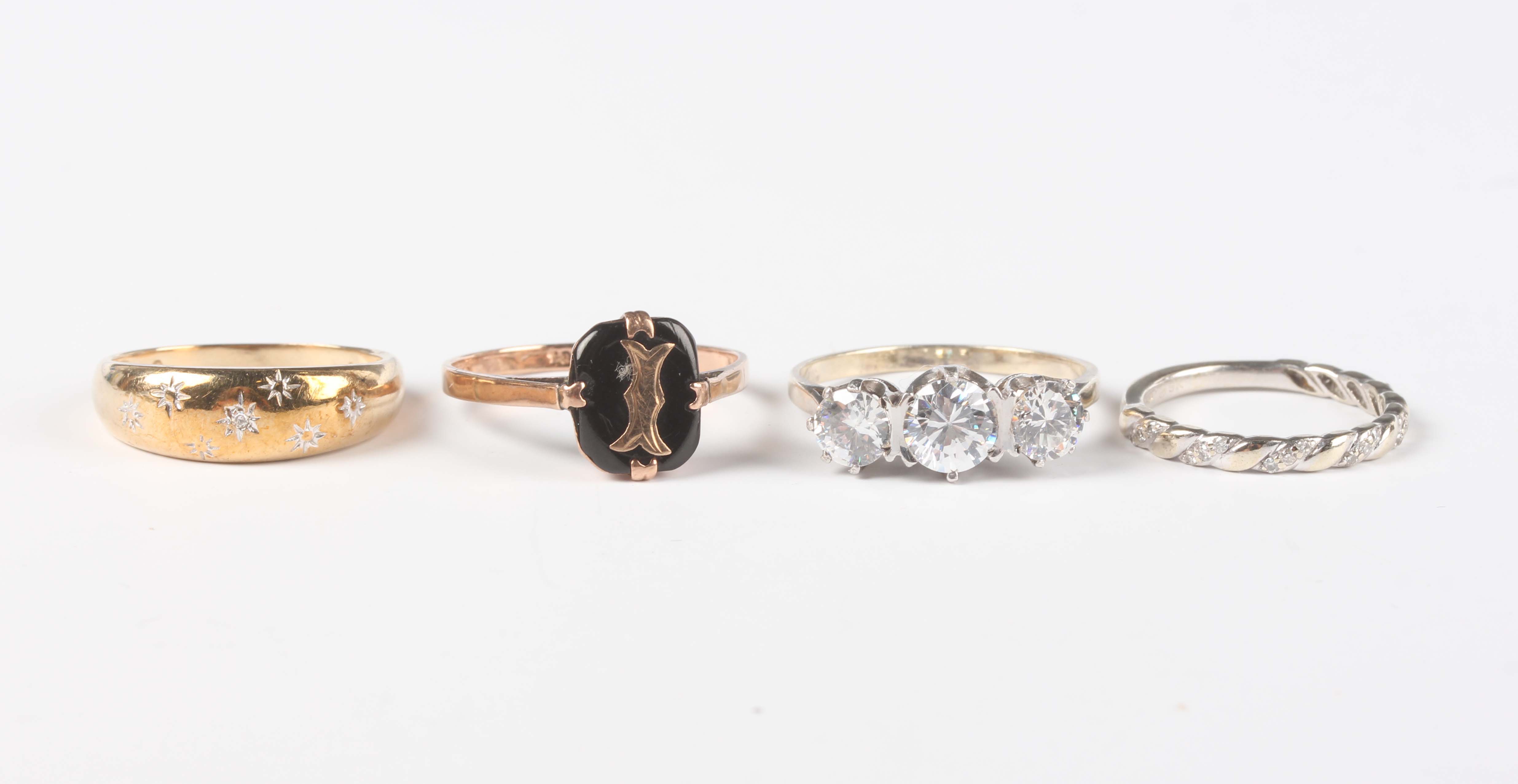 A 9ct white gold and diamond ring, mounted with rows of circular cut diamonds in a slanting design, ring size approx I1/2 (one diamond lacking), a gold and diamond single stone ring with star shaped motifs, detailed ‘375’, ring size approx M1/2, a gold ring, mounted with an initial 'I' on a black paste ground, detailed ‘9ct’, ring size approx Q1/2, total weight 5.7g, and a silver gilt and colourless gem set three stone ring, detailed ‘SIL’, ring size approx P1/2.