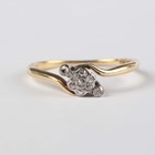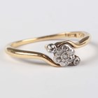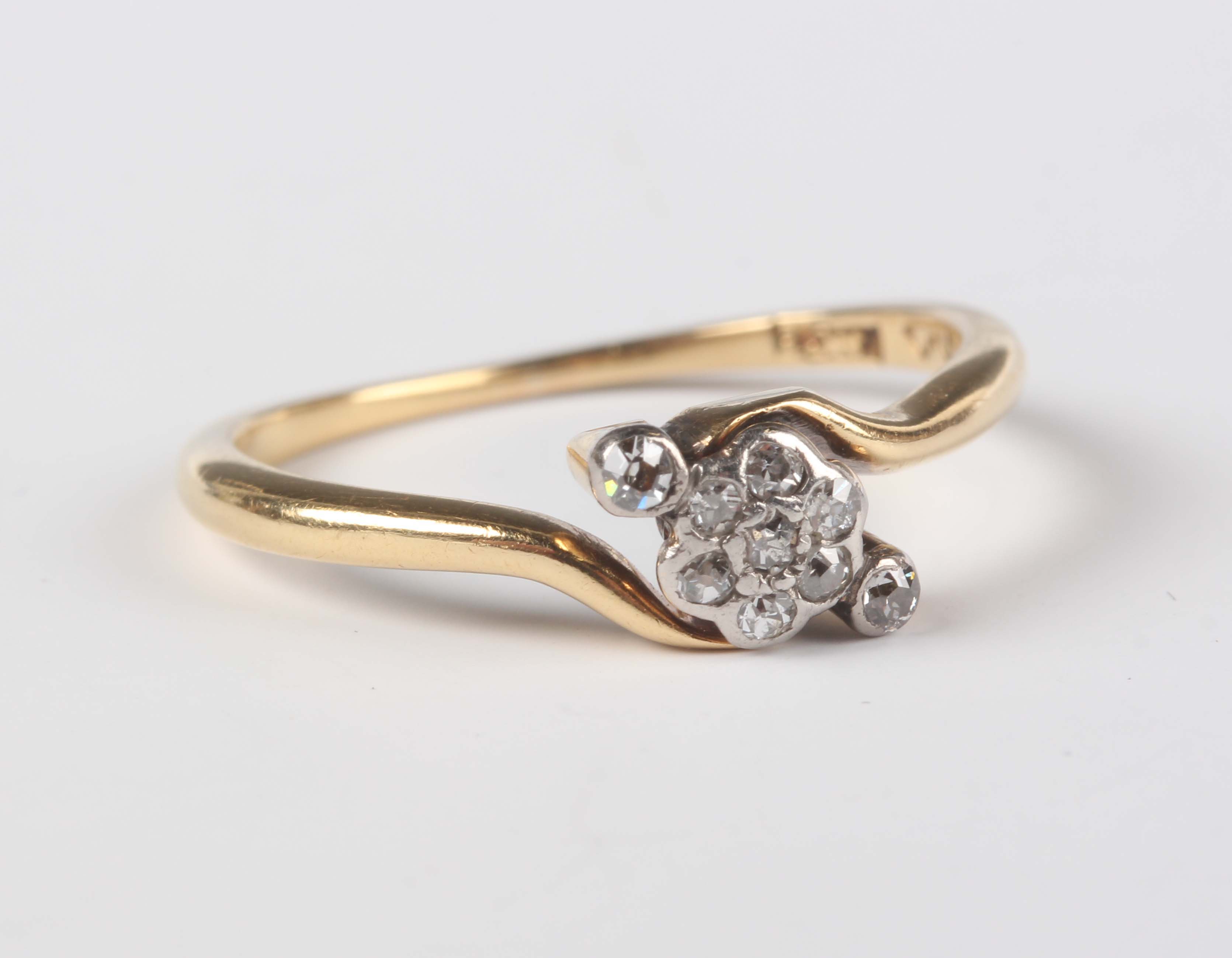 A gold and diamond cluster ring in a twistover design, mounted with cushion shaped diamonds between diamond set sides, detailed ‘18ct’, weight 2.6g, ring size approx N.