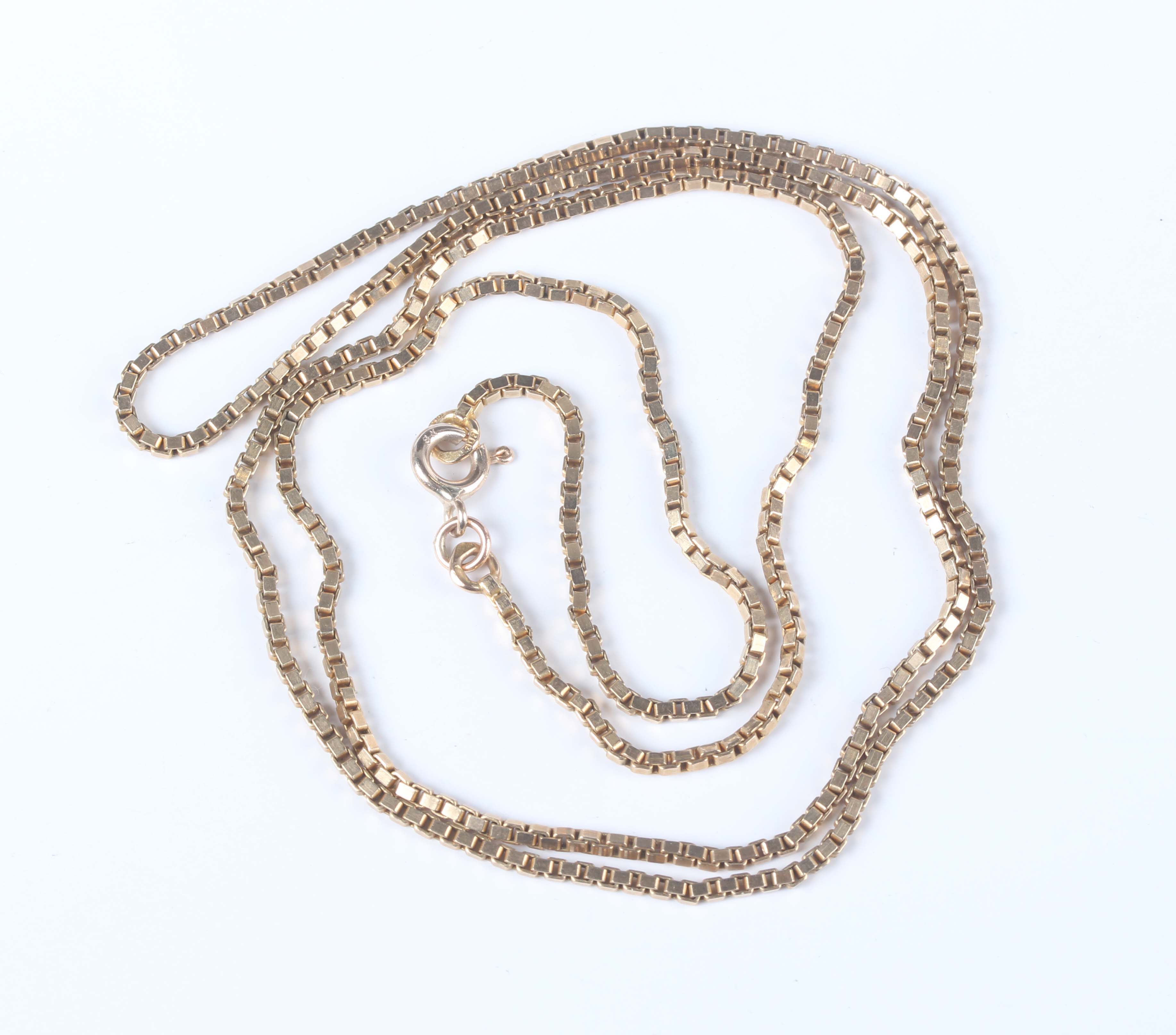 A 9ct gold box link neckchain on a boltring clasp, detailed ‘9K’, weight 10.2g, length 66cm.