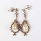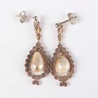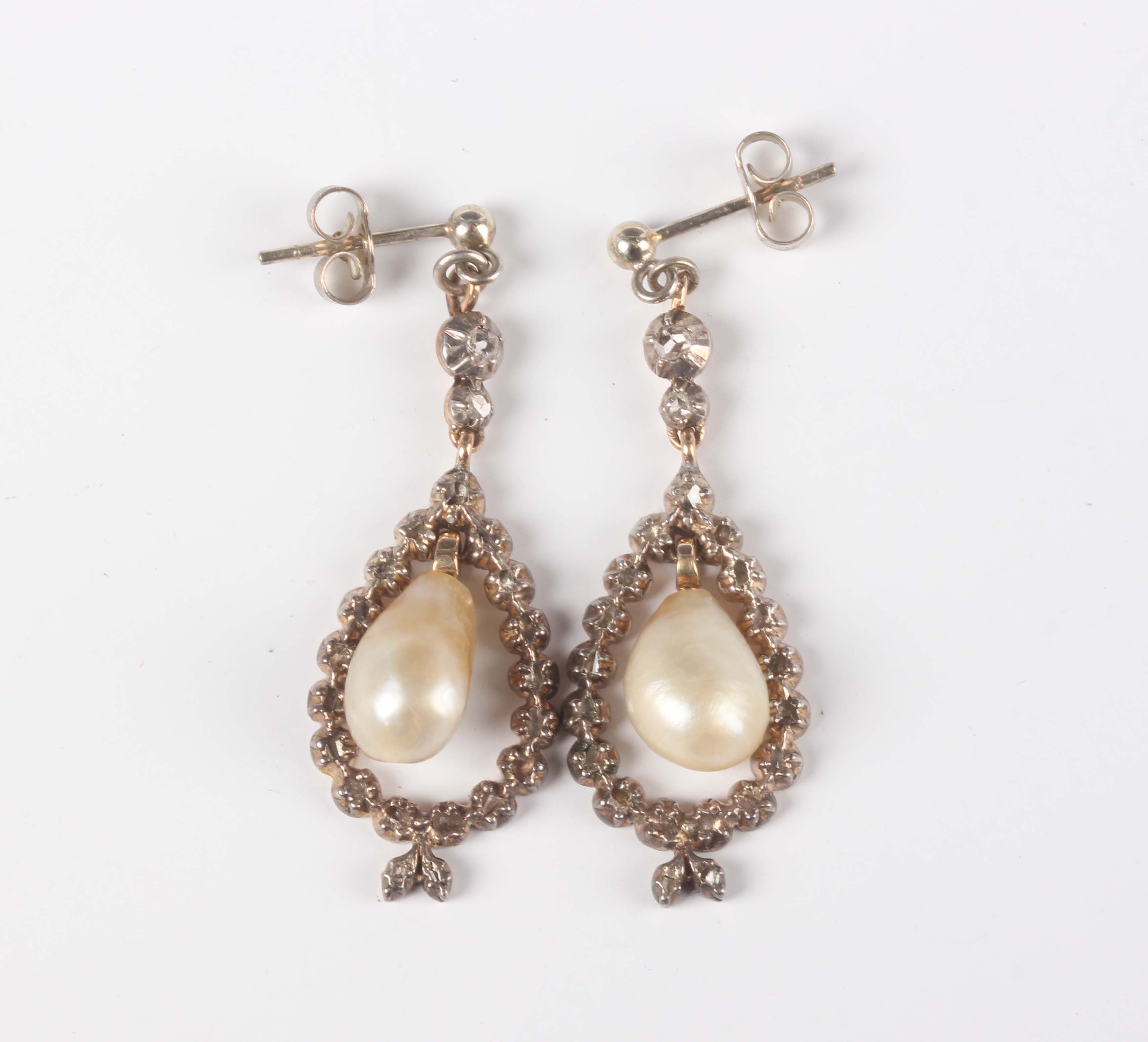 A pair of diamond and freshwater cultured pearl drop shaped pendant earrings, each with a pendant freshwater cultured pearl swing centre within a diamond surround, with later post and silver butterfly fittings, total weight 5.8g, length 3.8cm.
