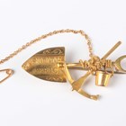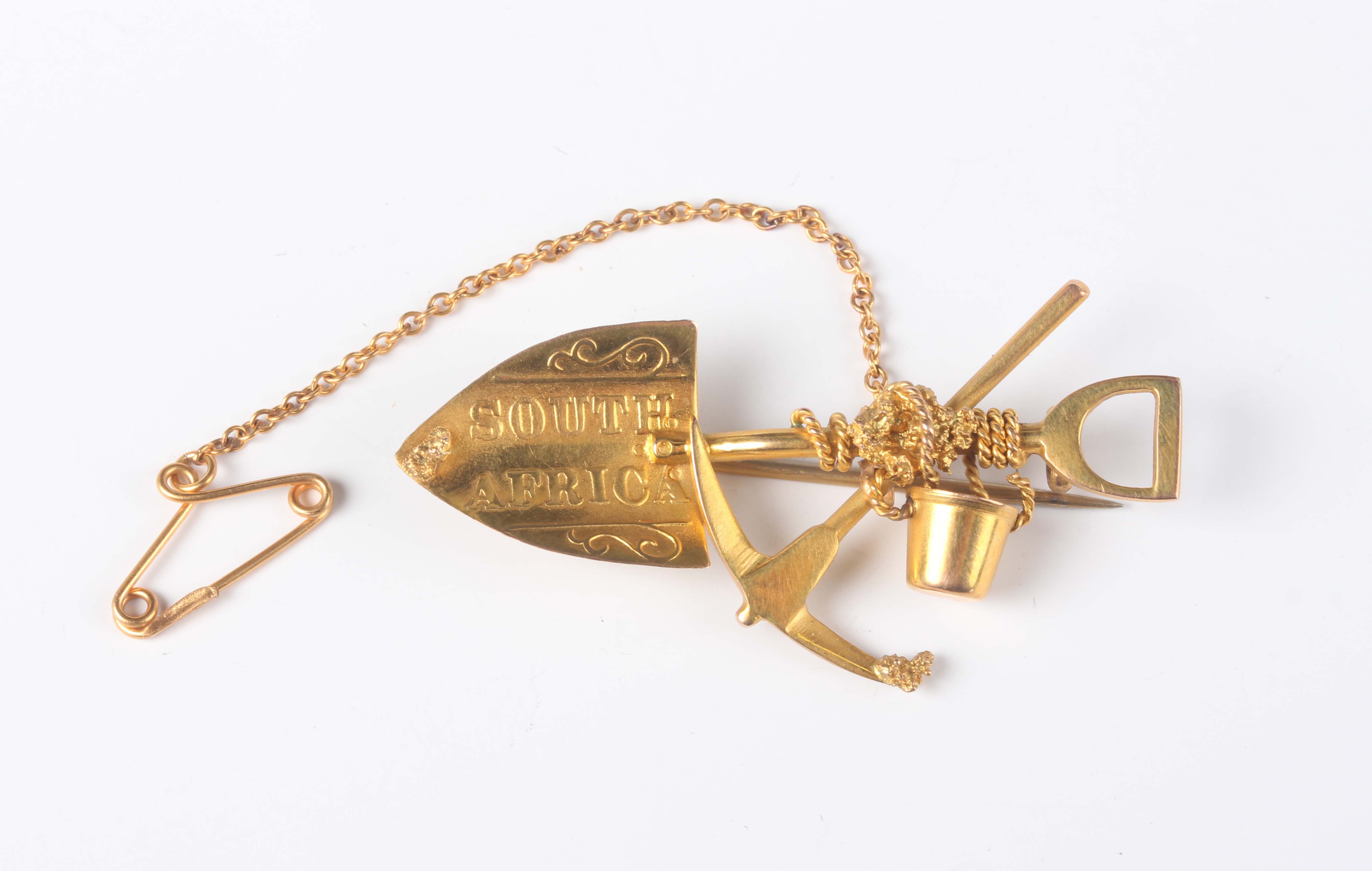 A gold mining prospector's brooch, designed as a pick, a shovel and a bucket, detailed ‘South Africa 9ct’, fitted with a safety chain, weight 3.5g, length 4.5cm.