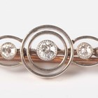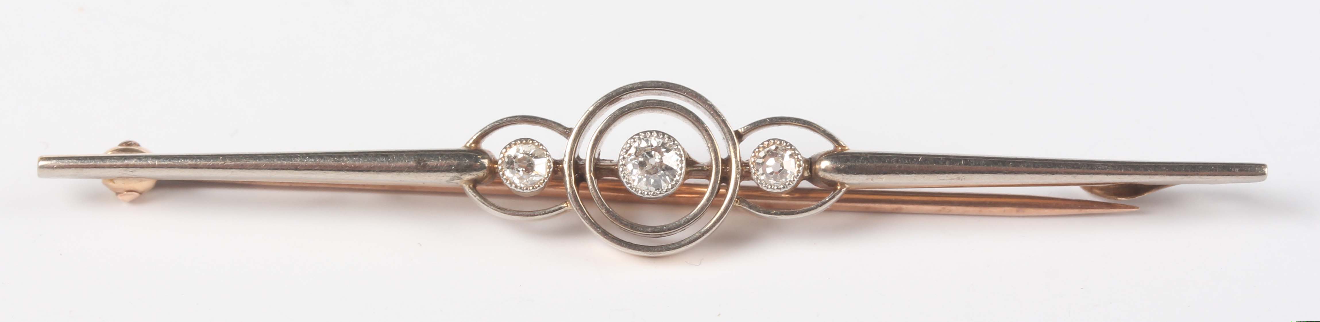 A gold and diamond three stone bar brooch, collet set with three cushion shaped diamonds within an openwork surround, circa 1910, weight 3.1g, width 5.9cm.