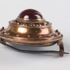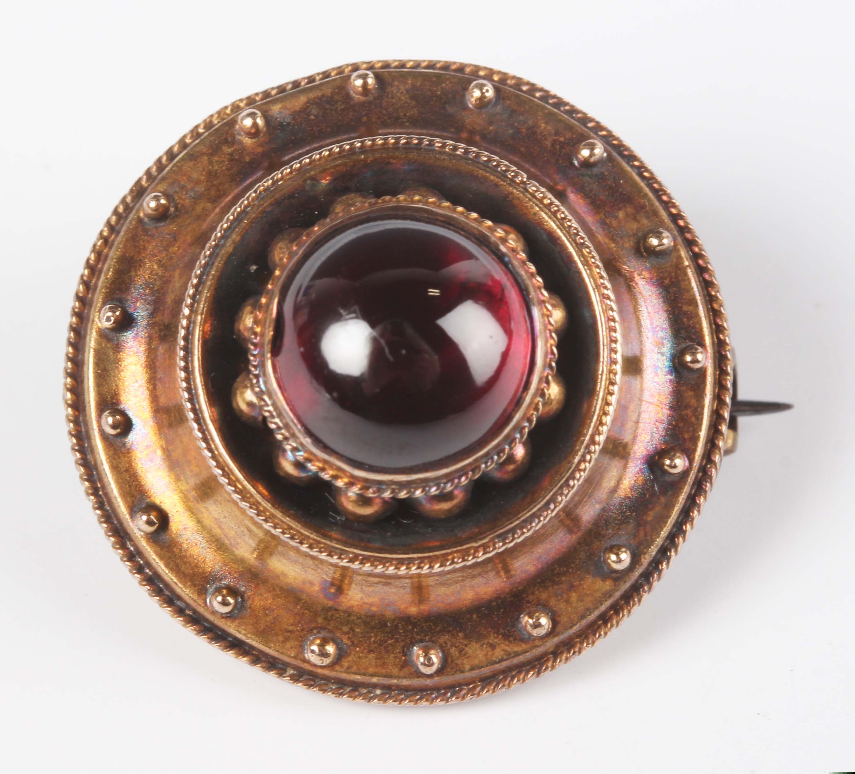 A Victorian carbuncle garnet circular brooch, the central carbuncle garnet within a beaded surround and ropetwist wirework borders, the back glazed with a locket compartment, weight 4.8g, diameter 2.3cm.