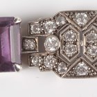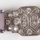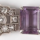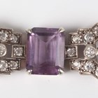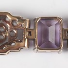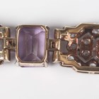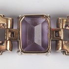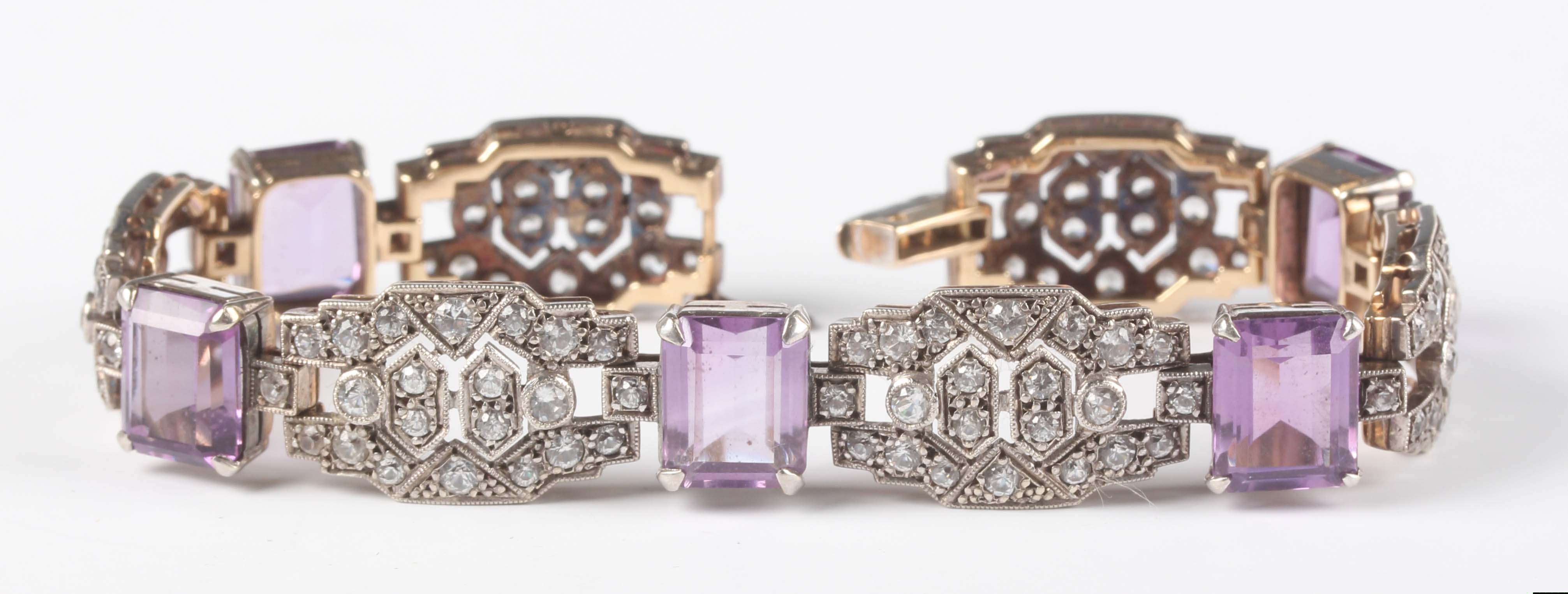 A 9ct gold, amethyst and colourless gem set bracelet in a geometric design, claw set with five rectangular step cut amethysts alternating with colourless gem set shaped rectangular panels, detailed ‘JHC 9ct’, on a foldover clasp, fitted with a safety catch, weight 27.1g, length 17.5cm, with a fitted case.