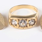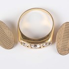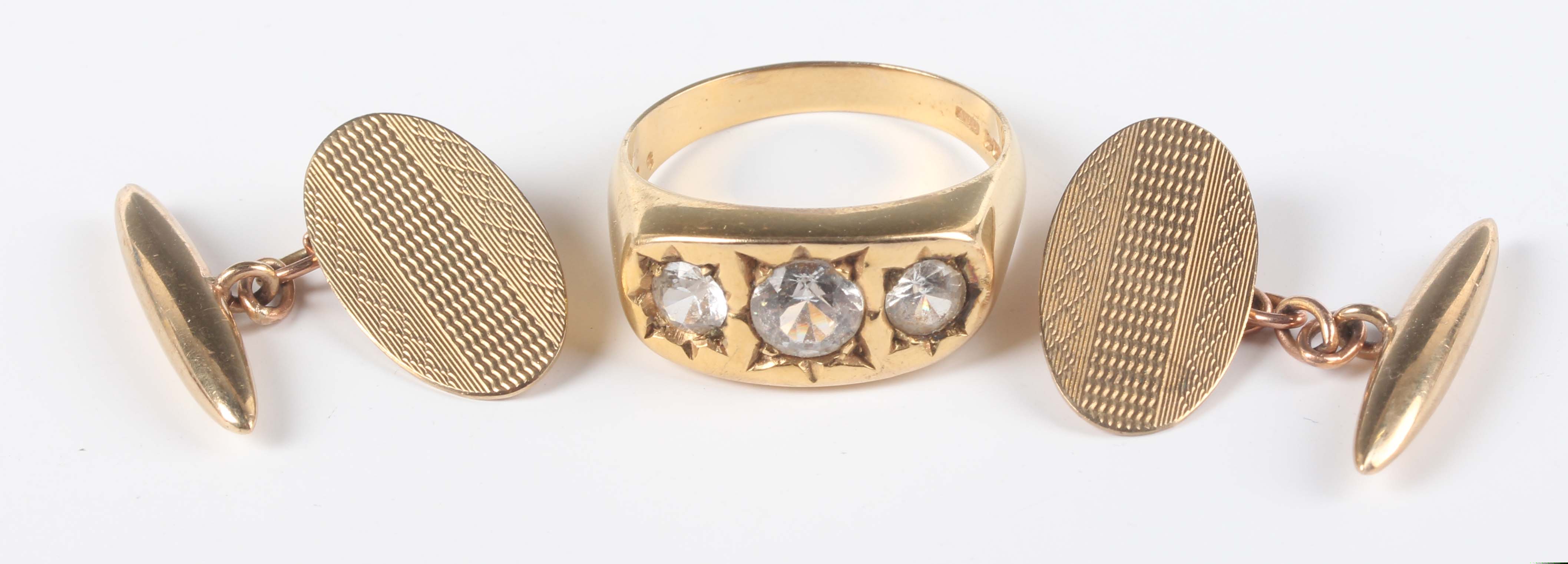 A 9ct gold and colourless paste set ring, ring size approx W, and a pair of 9ct gold cufflinks, the oval fronts with engine turned decoration and torpedo backs, total weight 10.3g.