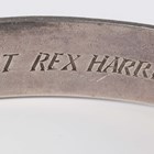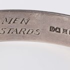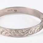 An Elizabeth II silver circular hinged bangle with engraved decoration, the interior with engraved comical inscription, Birmingham 1976, weight 24.3g, inside diameter 6cm.