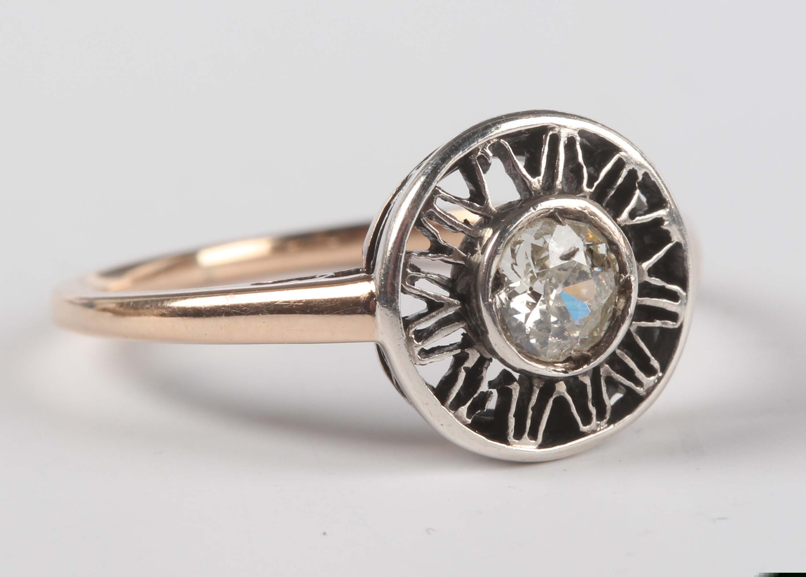 A gold and diamond single stone ring, collet set with a circular cut diamond within an open wirework surround, unmarked, weight 2.3g, ring size approx M1/2.