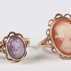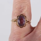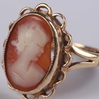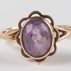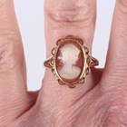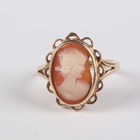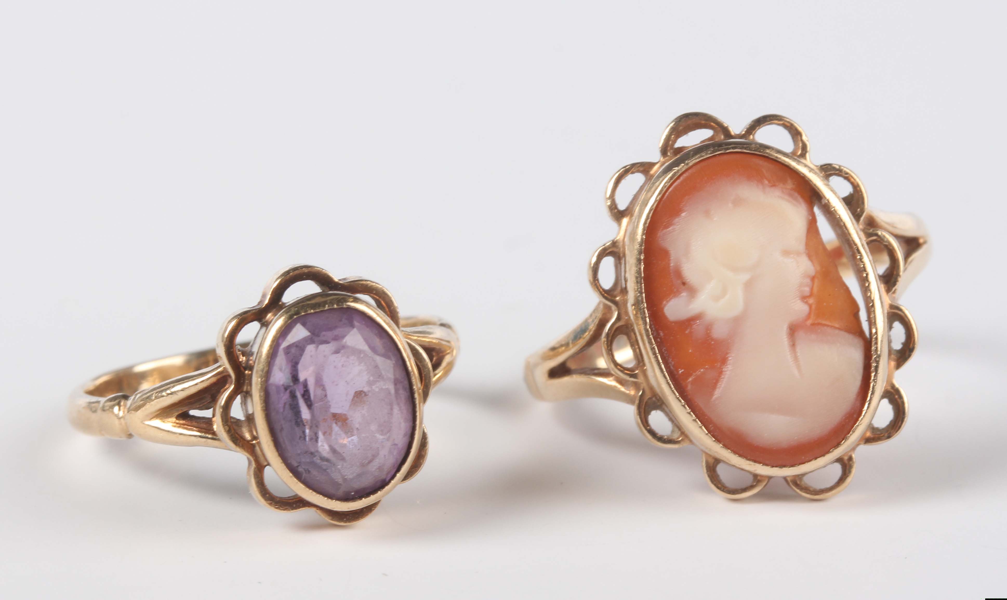 A gold and amethyst ring, collet set with an oval cut amethyst, detailed '9ct', ring size approx J1/2, and a gold and shell cameo ring, carved as a portrait of a young lady, detailed '9ct', ring size approx N1/2 (section of cameo lacking), total weight 5.2g.