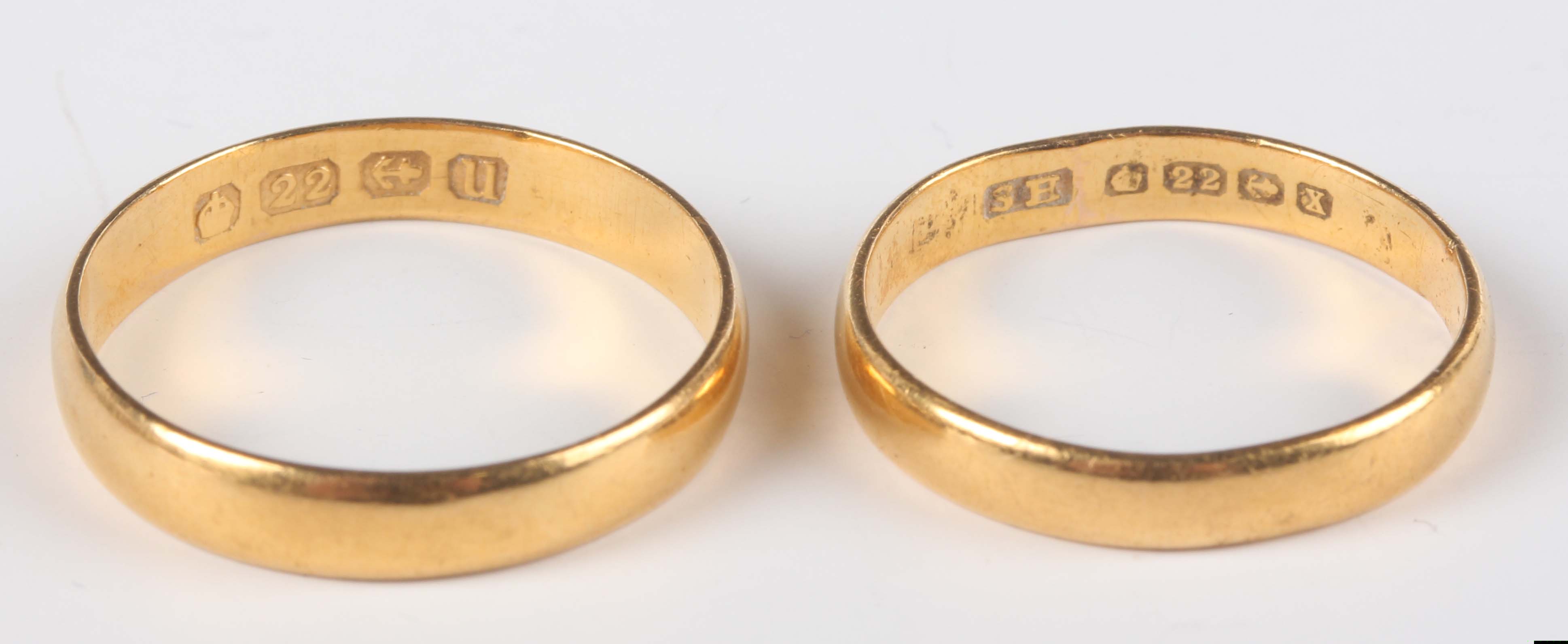 A 22ct gold wedding ring, weight 2.6g, ring size approx N, and a 22ct gold wedding ring, weight 2.3g, ring size approx J1/2.