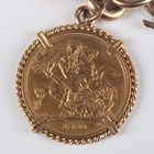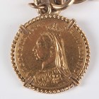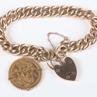 A 9ct gold curblink bracelet on a 9ct gold heart shaped padlock clasp, fitted with a Victorian Jubilee Head sovereign 1890 in a ropetwist mount, total weight 53g, length 18cm.