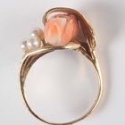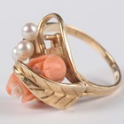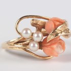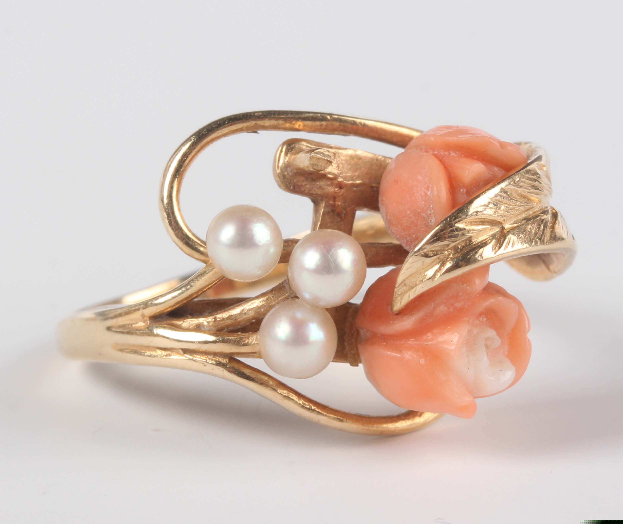 A gold, coral and cultured pearl ring in a floral spray design, detailed ‘14K’, weight 3.8g, ring size approx J1/2 (one pearl lacking).