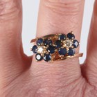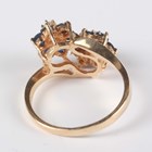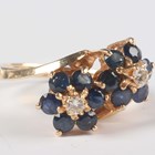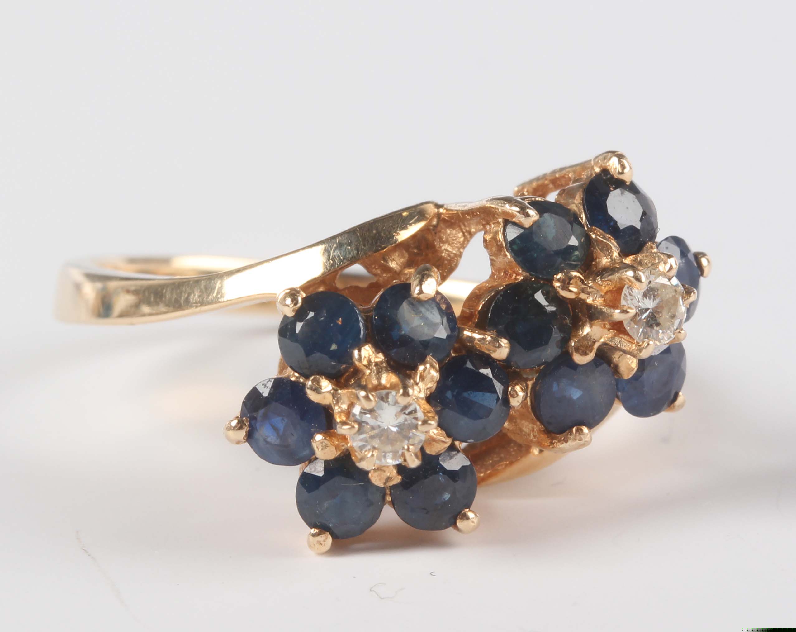 A gold, sapphire and diamond ring, designed as two seven stone flowerhead shaped clusters in a crossover design, detailed ‘14K’, weight 5.7g, ring size approx S1/2, with a case.