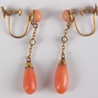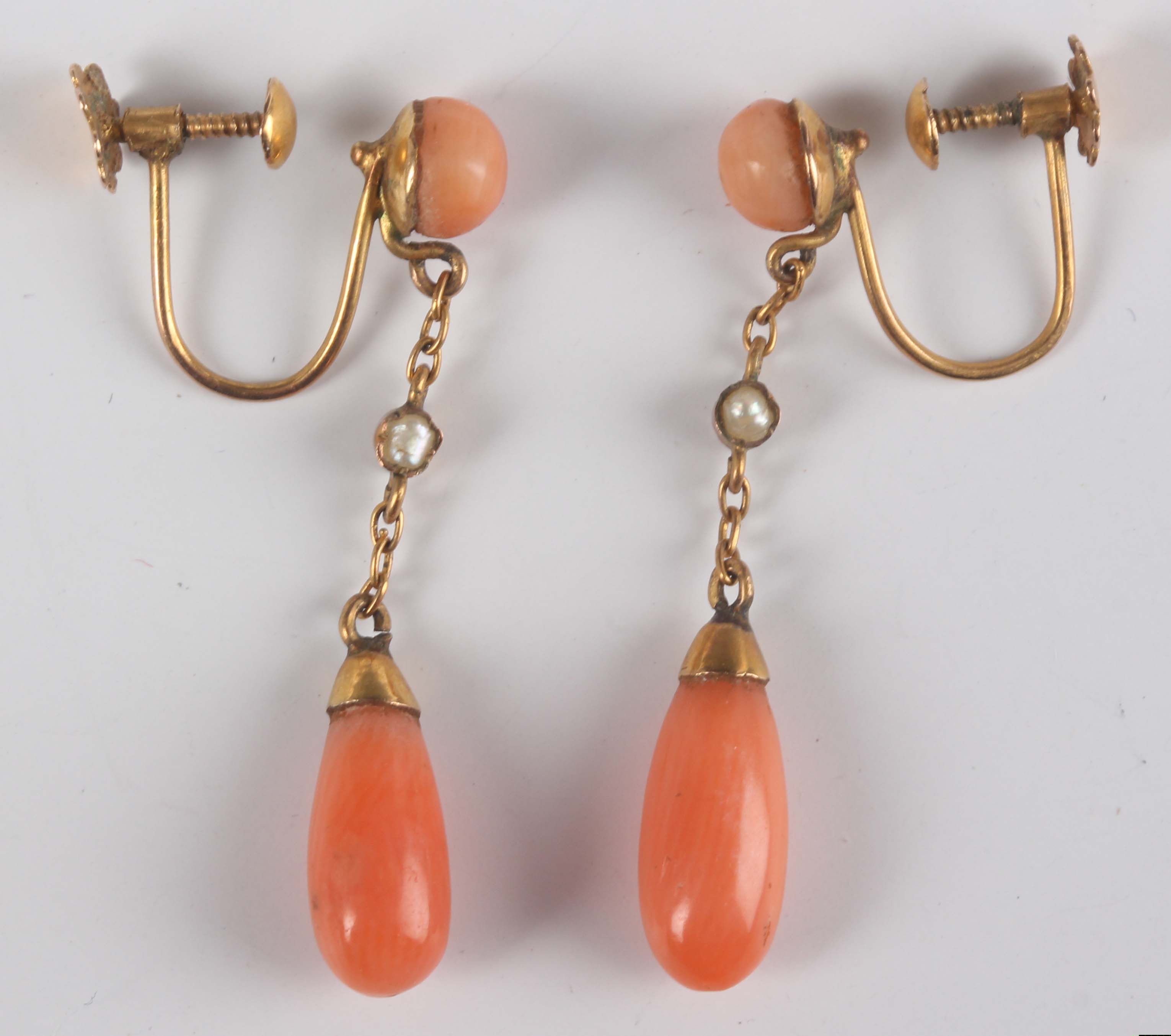 A pair of gold, coral and seed pearl pendant earrings, each with a circular coral surmount above a seed pearl and coral drop, with screw fittings, detailed '9ct', total weight 1.6g, length 2.8cm.