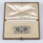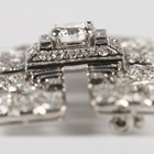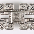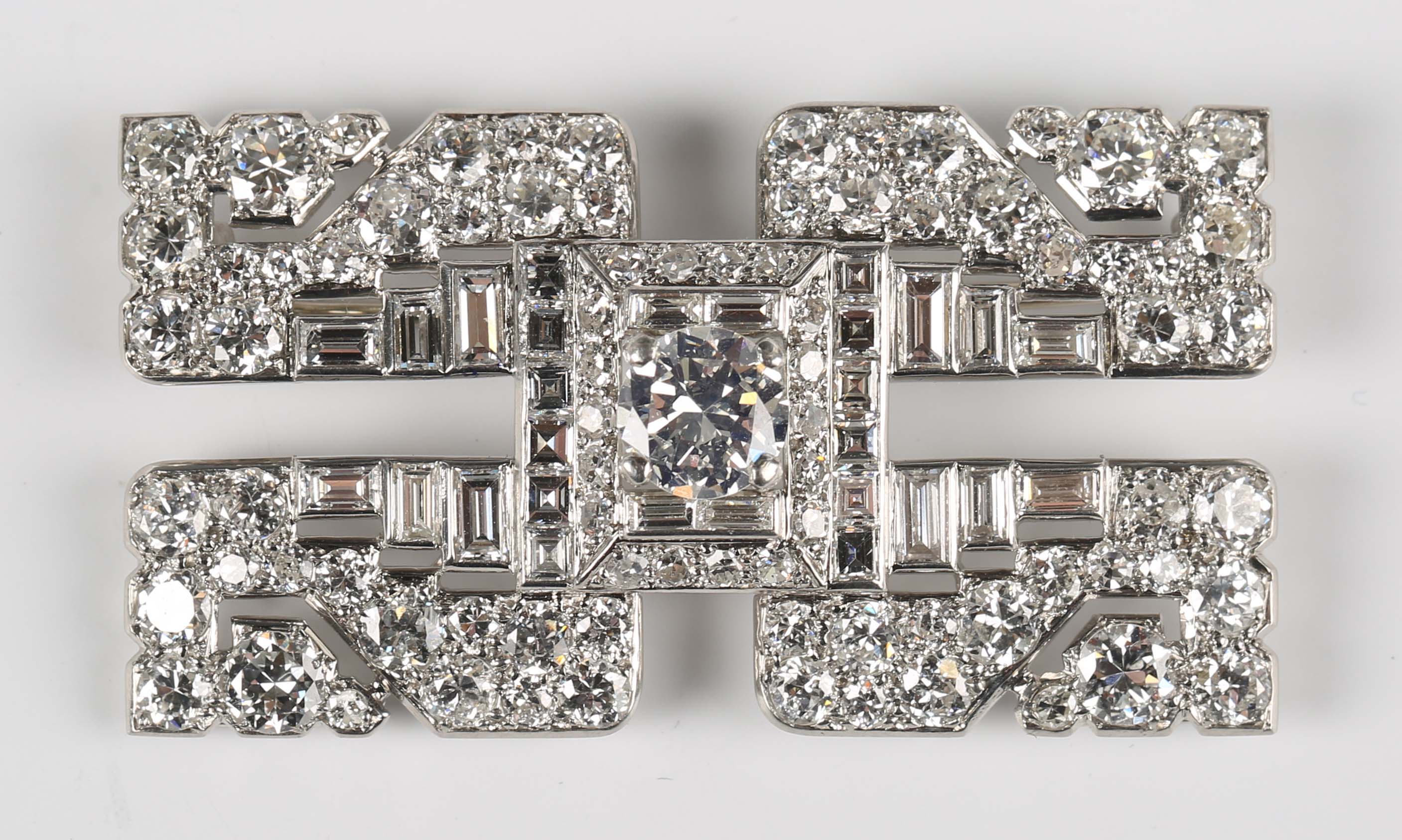 An Art Deco platinum and diamond brooch in a pierced geometric rectangular design, the principal circular cut diamond mounted to the centre, otherwise mounted with circular baguette and square emerald cut diamonds, engraved 'Cartier' to the back, weight 16.2g, principal diamond weight approx 1.25ct, colour grade approx I, clarity grade approx VS, total diamond weight approx 6.5ct-7.00ct, average colour grade approx H, average clarity grade approx SI1, width 4.7cm, with a Frazer & Haws case.