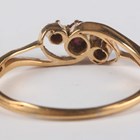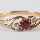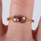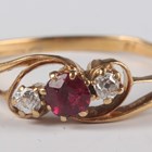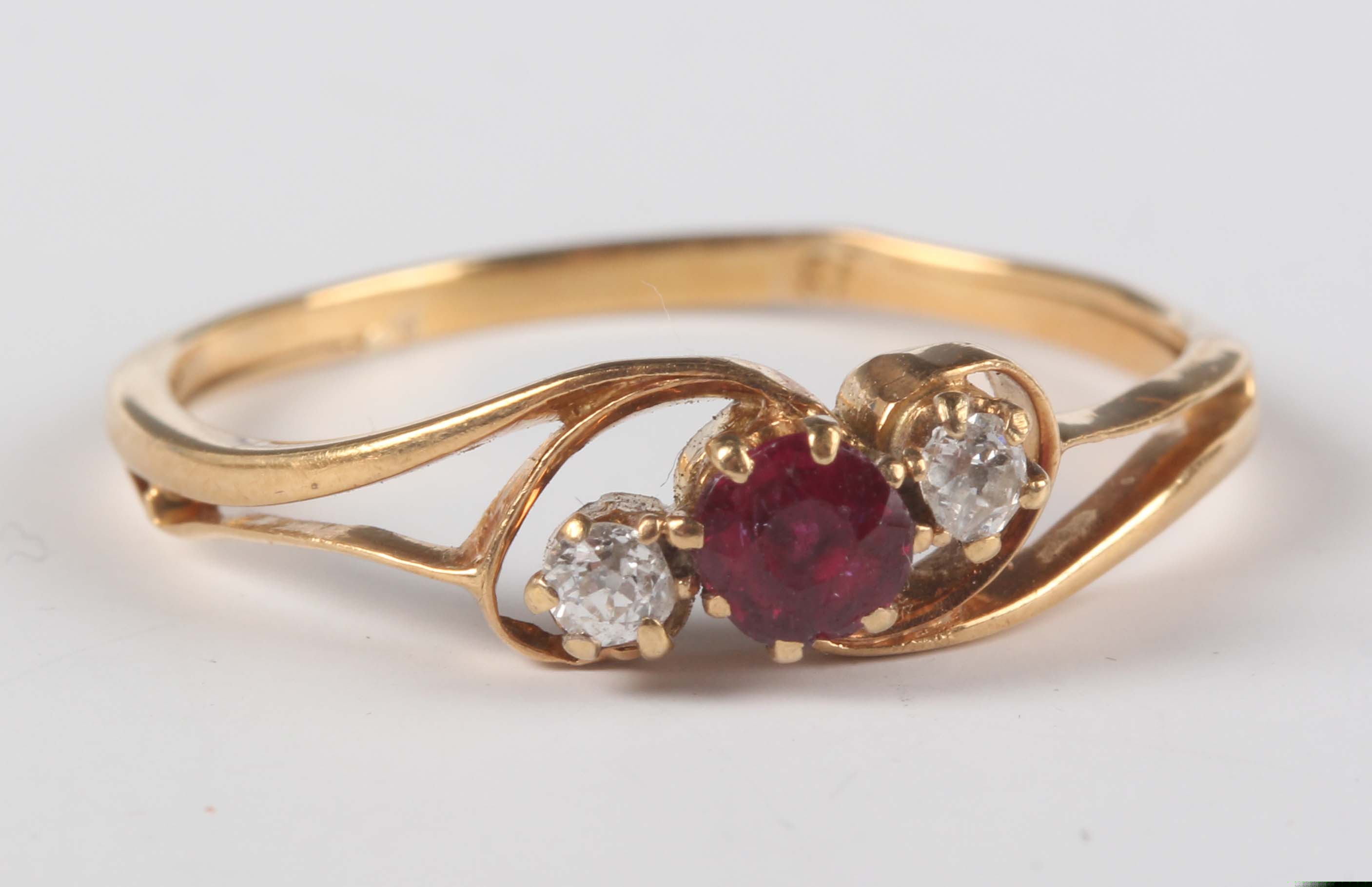 A gold, ruby and diamond three stone ring, claw set with a cushion shaped ruby between two cushion shaped diamonds in a crossover design, detailed ’18’, weight 2.3g, ring size approx R.