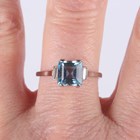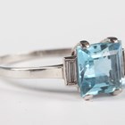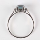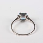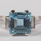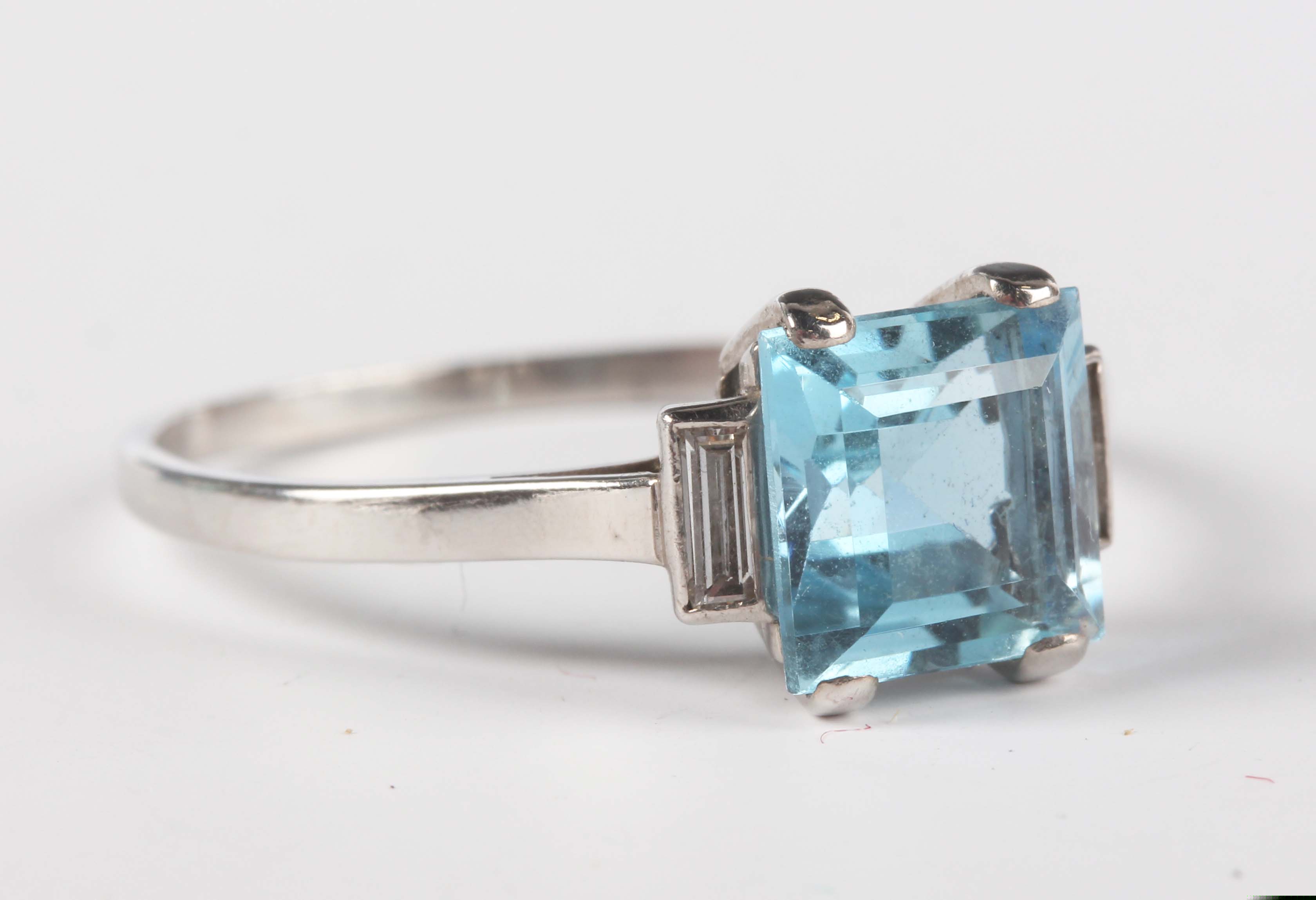 An aquamarine and diamond three stone ring, claw set with the square emerald cut aquamarine between baguette cut diamond single stone shoulders, unmarked, weight 3.3g, ring size approx R1/2.