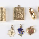 A gold charm in the form of a stein, detailed '585', a pair of clog charms, detailed '585', total weight 3.2g, and four other gold charms, comprising an enamelled gentian, an enamelled edelweiss, a heart enamelled 'Liebe Mich', and a folding photograph frame, total weight 3.5g.